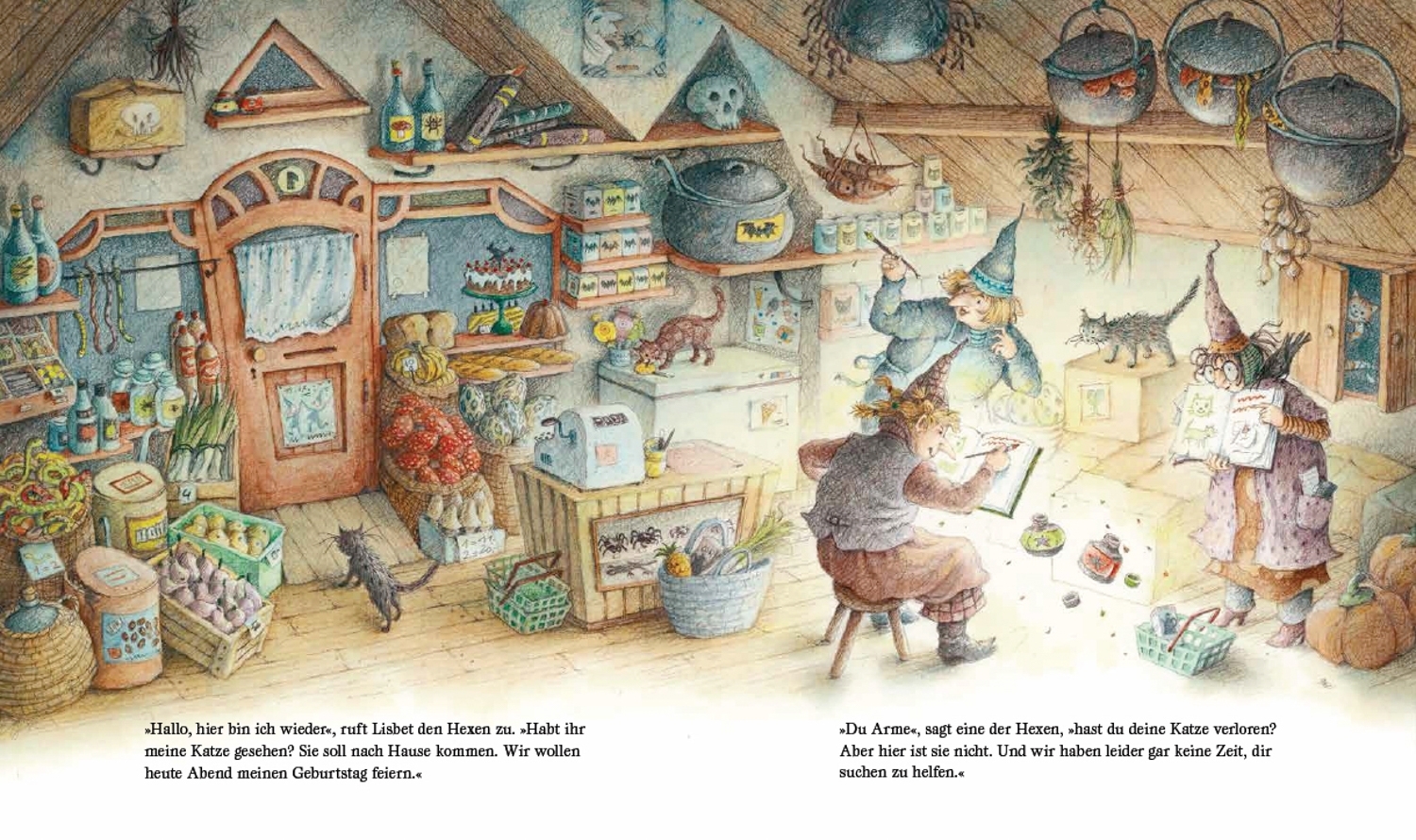 Lisbet, die kleine Hexe, hat Geburtstag. Klar, dass sie den auch feiern will. Mit einer richtig schönen Geburtstagstorte. Und weil Backen nicht ihre Sache ist und Zaubern schließlich gelernt sein will, besorgt Lisbet sich die Torte in Hexendorf. Als sie zurückkommt, ist ihre Katze verschwunden. Ohne Katze kann Lisbet aber unmöglich Geburtstag feiern. Was nun, kleine Hexe?