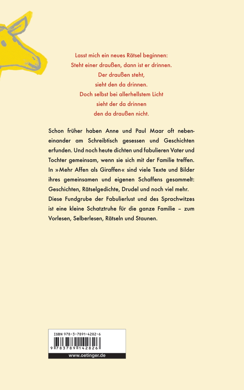 Ein Geschichten-, Reim- und Bilderreigen: der Familienschatz von Paul und Anne Maar Fabulierfamilie! Schon früher haben Paul Maar und seine Tochter Anne zusammen Geschichten erfunden. Auch heute dichten Vater und Tochter gemeinsam, wenn sie sich mit der Familie treffen - und das Beste davon ist in der Anthologie "Mehr Affen Als Giraffen" zusammengestellt. Eine Fundgrube voller Geschichten, Rätselgedichte, Drudel und anderen Wortspielereien - gemeinsam entwickelte und eigene, mit farbigen und schwarzweißen Illustrationen von Verena Ballhaus und Paul Maar. Gedichte, Geschichten, Rätsel u.v.m. - mit zahlreichen farbigen und schwarz-weißen Bildern. Hochwertige Ausstattung mit Halbleinenrücken und Lesebändchen.