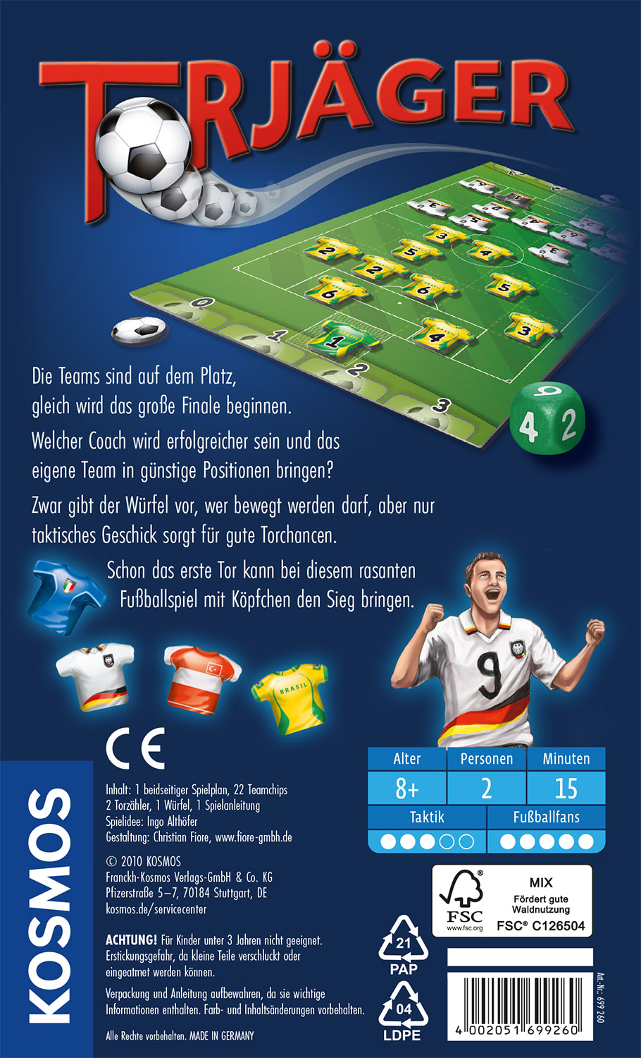 Die Mannschaften sind auf dem Platz, gleich wird das große Finale beginnen. Welcher Trainer wird erfolgreicher sein und die Spieler in günstige Positionen bringen? Zwar gibt der Würfel vor, welche Spieler bewegt werden dürfen, aber nur taktisches Geschick sorgt für gute Torchancen. Schon das erste Tor kann bei diesem rasanten Fußballspiel mit Köpfchen den Sieg bringen. Für 2 Spieler ab 8 Jahren. Spieldauer: ca. 20 Minuten.