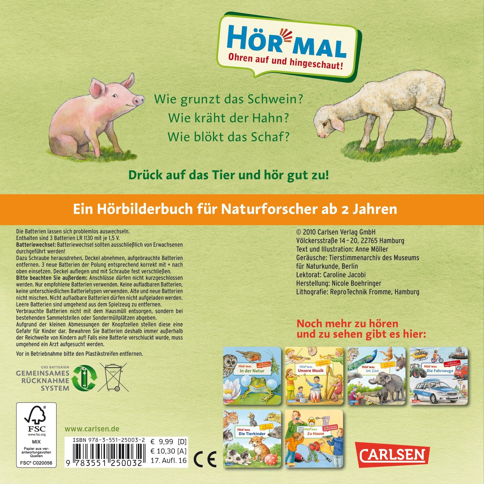 Das Hör mal mit 6 echten Tierstimmen und Naturgeräuschen erweckt den Bauernhof zum Leben. Ein Buch zum Hören und Schauen - mit erstklassiger Tonqualität und naturgetreuen Illustrationen.