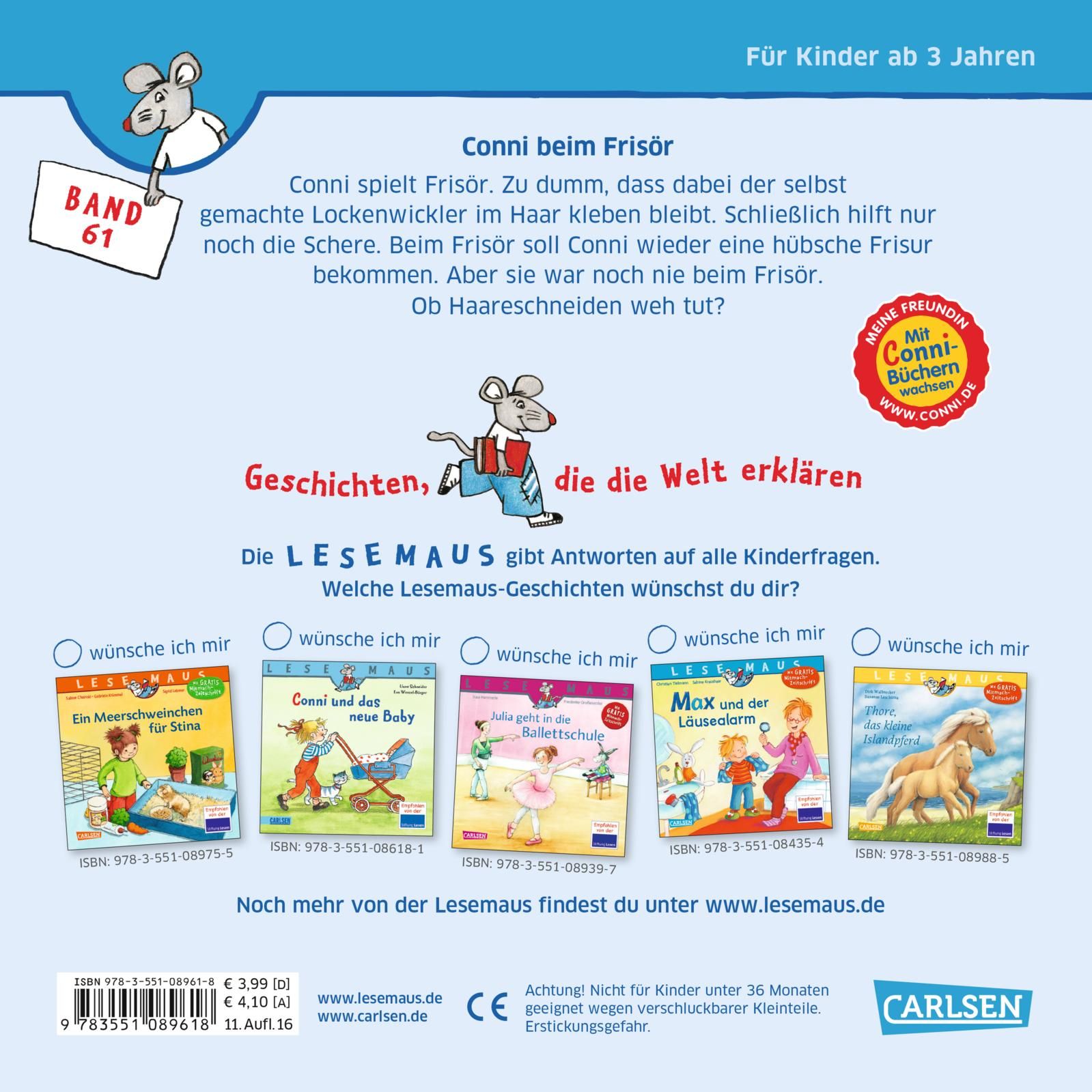 Conni spielt Frisör. Zu dumm, dass dabei der selbst gemachte Lockenwickler im Haar kleben bleibt. Schließlich hilft nur noch die Schere. Beim Frisör soll Conni wieder eine hübsche Frisur bekommen. Aber Conni war noch nie beim Frisör. Ob Haareschneiden weh tut? Und was passiert mit Connis roter Schleife?