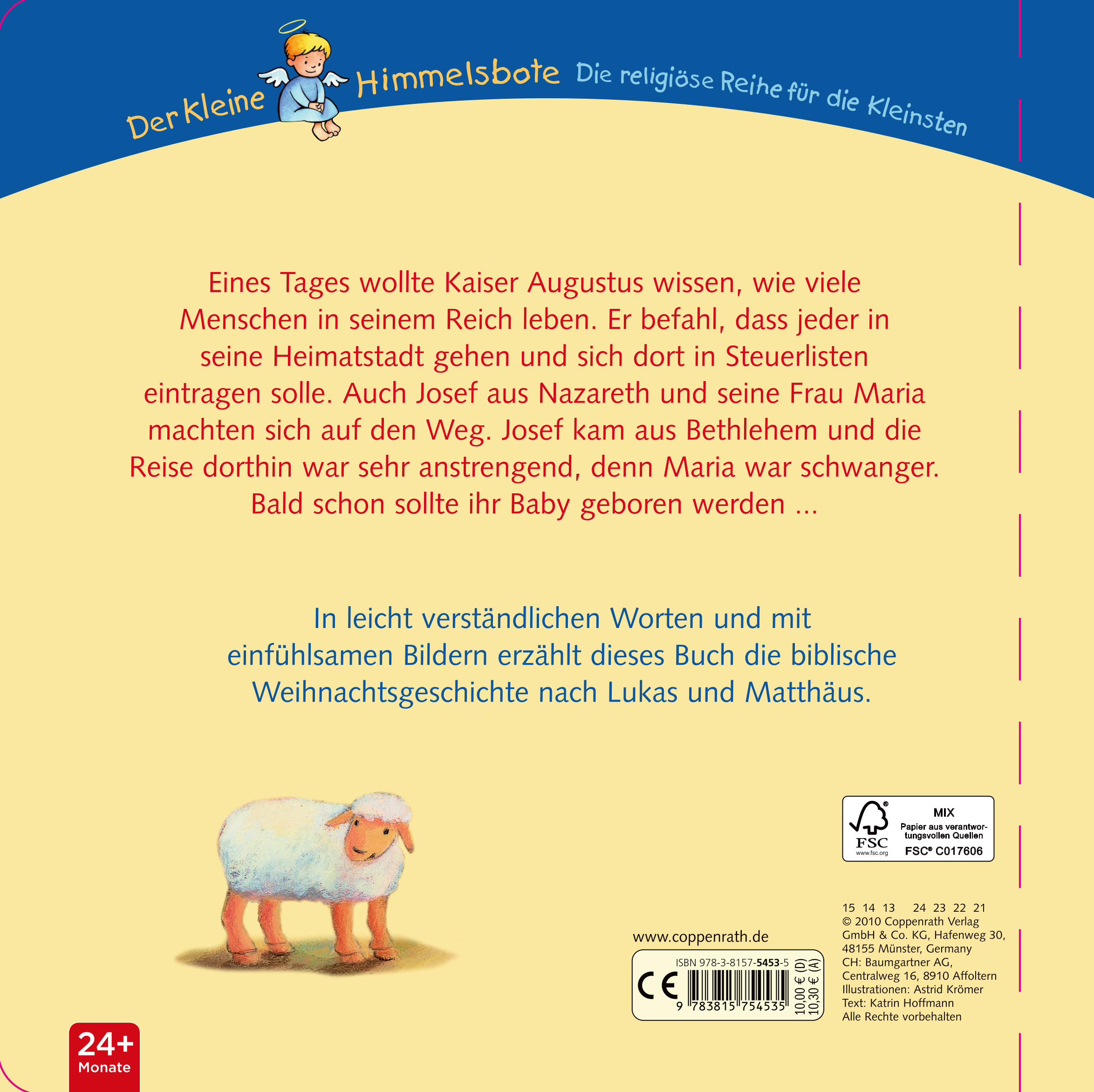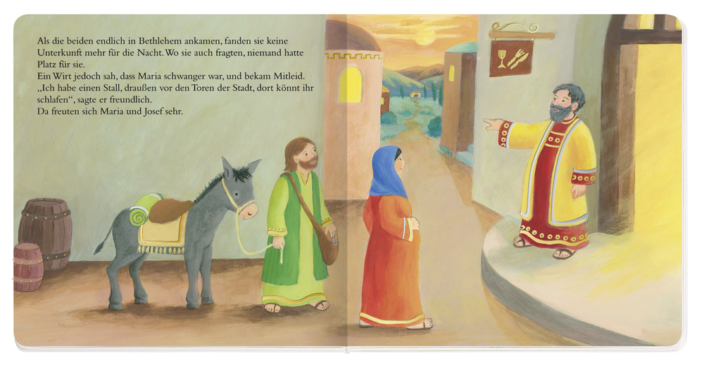 Eines Tages wollte Kaiser Augustus wissen, wie viele Menschen in seinem Reich leben. Er befahl, dass jeder in seine Heimatstadt gehen und sich dort in Steuerlisten eintragen solle. Auch Josef aus Nazareth und seine Frau Maria machten sich auf den Weg. Josef kam aus Bethlehem und die Reise dorthin war sehr anstrengend, denn Maria war schwanger. Bald schon sollte ihr Baby geboren werden.Mit ihren einfühlsamen Bildern erzählt Astrid Krömer nach Lukas und Matthäus vom Weihnachtswunder, das sich vor langer Zeit in Bethlehem zugetragen hat: der Geburt des Jesuskindes. Ein stimmungsvolles, leicht verständliches Buch schon für die Kleinsten.