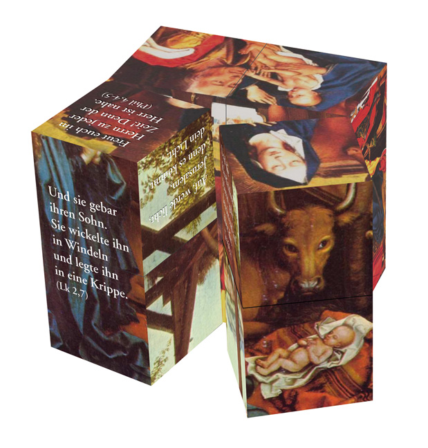 In vielen Klapp- und Drehmöglichkeiten zeigt dieser Würfel anhand zweier Kunstwerke berühmter Maler das Geschehen der Heiligen Nacht auf immer wieder neue und überraschende Weise. Ein vielseitiges und anspruchsvolles Geschenk zum Advent und zu Weihnachten, das mit seinem spielerischen Verwandlungseffekt, den ausgewählten Bibelzitaten und den Darstellungen aus der Kunst ein Mehr an Vertiefung und Nachhaltigkeit bietet. Der Würfel zeigt als Ganzes und im Detail folgende Werke: Martin Schongauer: Anbetung der Hirten (Lk 2, 8–20), um 1475–1480, Eichenholz, Gemäldegalerie Rogier van der Weyden: Dreikönigsaltar, Mitteltafel: Anbetung der Heiligen Drei Könige (Mt 2, 1–12), 2. Drittel 15. Jh., Öl auf Holz, München, Alte Pinakothek