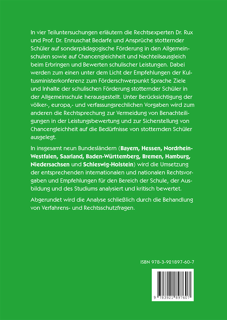Vorwort des Herausgebers zur 3. erweiterten Auflage Das Thema Stottern und Schule ist in Zeiten schulischer Inklusion aktueller denn je. Stottern verunsichert Schüler und Schülerinnen, ihre Eltern sowie Lehrkräfte. Viele reagieren betroffen, sind aber oft unzureichend informiert, was ihre Rechte und Möglichkeiten, Bedarfe und Ansprüche betrifft. Als Interessenvertretung stotternder Menschen ist die Bundesvereinigung Stottern & Selbsthilfe e.V. (BVSS) erster Ansprechpartner für Ratsuchende. Sowohl in der telefonischen Beratung als auch im Rahmen unserer Informations- und Aufklärungsarbeit auf Messen wie der Didacta stellen wir fest, dass bundesweit ein enormer Informationsbedarf besteht. Dieser Informationsbedarf richtet sich nicht ausschließlich auf den schulischen Bereich, sondern umfasst alle Ausbildungsbereiche junger Menschen, von der betrieblichen Ausbildung bis hin zum Studium. So ist vielen Betroffenen und Lehrkräften zwar bekannt, dass die Gewährung eines Nachteilsausgleichs in der Schule möglich ist. Dass diese ebenso in der Ausbildung und im Studium greift, ist weniger bekannt. Das Deutsche Studentenwerk hat im Dezember 2016 eine groß angelegte Umfrage zum Thema Nachteilsausgleich im Studium gestartet. Mit der nun vorliegenden 3. erweiterten Auflage zu den Rechten stotternder Menschen in Schule, Ausbildung und Studium ergänzen wir die Teiluntersuchungen aus 2010, die sich bisher auf die vier Bundesländer Bayern, Hessen, Nordrhein-Westfalen und Saarland konzentrieren. In unserer Rechtsanalyse finden sich nun außerdem Untersuchungen der Rechtslage in Baden-Württemberg (Stand 2013) sowie in den Ländern Bremen, Hamburg, Niedersachsen und Schleswig-Holstein (Stand 2016). Zur einfacheren Orientierung gliedert sich „Die Rechte stotternder Menschen in Schule, Ausbildung und Beruf“ nun in die folgenden vier Teile, die jeweils zu unterschiedlichen Zeiten verfasst wurden: Teil 1: Die Rechte stotternder Menschen … (Rux, 2008 - 2010) für Bayern, Hessen, Nordrhein-Westfalen und Saarland Teil 2: Nachteilsausgleich … (Ennuschat, 2010) für Bayern, Hessen, Nordrhein-Westfalen und Saarland Teil 3: Rechte und Nachteilsausgleich … (Ennuschat, 2013) für Baden-Württemberg Teil 4: Rechte und Nachteilsausgleich … (Ennuschat, 2017) für Bremen, Hamburg, Niedersachsen, Schleswig-Holstein Auch wenn diese Form der Veröffentlichung eher unkonventionell scheint, so freuen wir uns, dass wir dank der Unterstützung durch die Landesverbände der Bundesvereinigung Stottern & Selbsthilfe mit dieser lang erhofften und umfassenderen Rechtsanalyse einen weiteren wertvollen Beitrag zur Verbesserung der Situation stotternder Schüler und Schülerinnen leisten können. Köln, im März 2017 Prof. Dr. Martin Sommer Vorsitzender der Bundesvereinigung Stottern & Selbsthilfe e.V. Vorwort des Herausgebers Stotternde Schüler und Schülerinnen sehen sich in der Schule mit besonderen Schwierigkeiten konfrontiert. Zum einen kann die dortige ungünstige Kommunikationssituation einen wesentlichen Beitrag zur progressiven Entwicklung ihres Stotterns leisten. Zum anderen unterliegen stotternde Schüler einem deutlich erhöhten Risiko für Hänseleien und Mobbing, die das Stottern weiter verstärken und verfestigen und zu erheblichen psychischen Belastungen führen können. Darüber hinaus können mit der Sprechbehinderung massive Beeinträchtigungen in der mündlichen Beteiligung und mündlichen Leistung verbunden sein, was Benachteiligungen in der Leistungsbewertung zur Folge hat. Daher gehören auch chronisch stotternde Schüler nach Beschluss der Kultusministerkonferenz (KMK, Empfehlungen zum Förderschwerpunkt Sprache, Beschluss vom 26.6.1998) zur Zielgruppe für eine besondere schulische Förderung, der sonderpädagogischen Förderung im Bereich der Sprache. Diese ist mittlerweile in allen Bundesländern verankert und soll das Recht der sprachbehinderten Kinder und Jugendlichen auf eine ihren persönlichen Möglichkeiten entsprechende schulische Bildung und Erziehung verwirklichen. Dabei ist laut Beschluss der KMK Aufgabe der sonderpädagogischen Förderung (1) einer Entstehung oder Verfestigung der Sprachbeeinträchtigungen entgegenzuwirken und damit Auswirkungen auf die personale und soziale Entwicklung zu verhindern, (2) die jeweilige sprachliche Beeinträchtigung und deren Erscheinungsbild zu erkennen, (3) die Bedeutung der sprachlichen Beeinträchtigung für den betroffenen Schüler zu erschließen, (4) individuelle pädagogische Fördernotwendigkeiten in Erziehung und Unterricht zu begründen und wo immer möglich Beeinträchtigungen des sprachlichen Handelns aufzuheben und (5) eine bestmögliche schulische und berufliche Eingliederung und gesellschaftliche Teilhabe zu erlangen. Trotz des Beschlusses der KMK und trotz des vergleichsweisen geringen Aufwandes, der mit der Organisation der sonderpädagogischen Förderung sprachbehinderter Schüler in der Allgemeinschule verbunden ist (integrative Begleitung), sind von den ca. 130.000 stotternden Schülern in deutschen Allgemeinschulen heute weniger als 0,1% in einer sonder/integrationspädagogischen Förderung. Dies ist zum einen darauf zurückzuführen, dass das Ausmaß der Beeinträchtigung in der (sonder-)pädagogischen Beurteilung unterschätzt und grundsätzlich davon ausgegangen wird, dass stotternde Schüler ohne Unterstützung in den Allgemeinschulen zurecht kommen. Ein Grund für diese folgenschwere Fehleinschätzung dürfte sicher sein, dass Stottern in der sonder pädagogischen/sprachheilpädagogischen Ausbildung ebenso wie in den akademischen Studiengängen der Sprachtherapeuten thematisch so gut wie nicht vertreten ist und die wenigen auf Stottern spezialisierten deutschen Fachleute in den schulpolitischen Entscheidungsebenen kein Gehör finden. Ein weiterer Grund ist sicherlich auch, dass in den Schuleingangsuntersuchungen stotternde Kinder so gut wie nicht erkannt werden und den bildungspolitischen Entscheidungsträgern somit