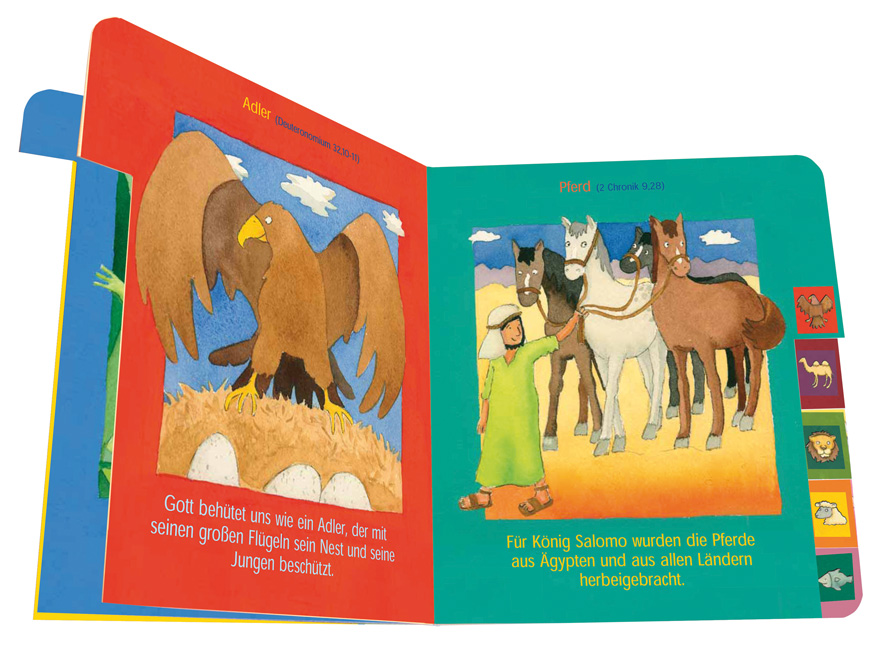 Die beliebtesten Tiere aus der Bibel für die Kleinen als stabiles Pappstanzbuch. Kinder haben einen besonderen Bezug zu Tieren. Das Tier-Bilder-Buch der Bibel greift dies auf und bietet mit seinen ansprechenden Bildern, kurzen Texten und dem praktischen Griffregister als Suchhilfe für die Kleinen eine erste Hinführung in die Welt der Bibel und zum christlichen Glauben.