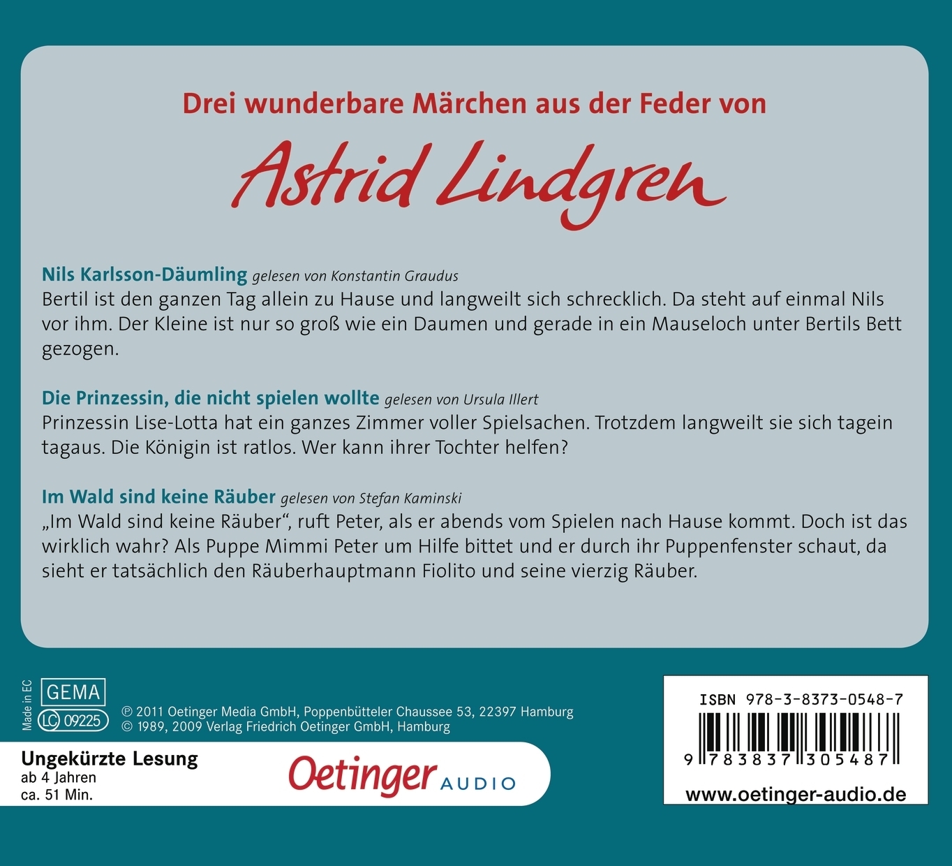Wer hat Lust, Nils Karlsson in seiner mauselochkleinen Wohnung zu besuchen? Oder Mimi im Puppenhaus vor Räubern zu bewahren? Astrid Lindgrens zauberhafte Märchen nehmen Wünsche der Kinder ernst und entführen die Hörer in große Abenteuer! Neue Lesung von drei beliebten Lindgren-Märchen mit verschiedenen Sprechern.