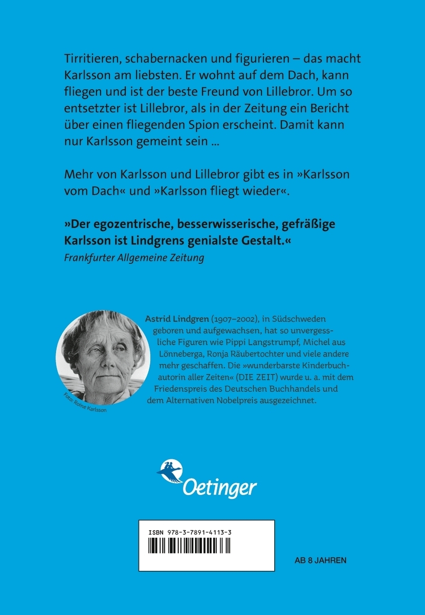 lt;p>Tirritieren, schabernacken und figurieren - das macht Karlsson am liebsten. Er wohnt auf dem Dach, kann fliegen und ist der beste Freund von Lillebror. Um so entsetzter ist Lillebror, als in der Zeitung ein Bericht über einen fliegenden Spion erscheint. Damit kann nur Karlsson gemeint sein ...