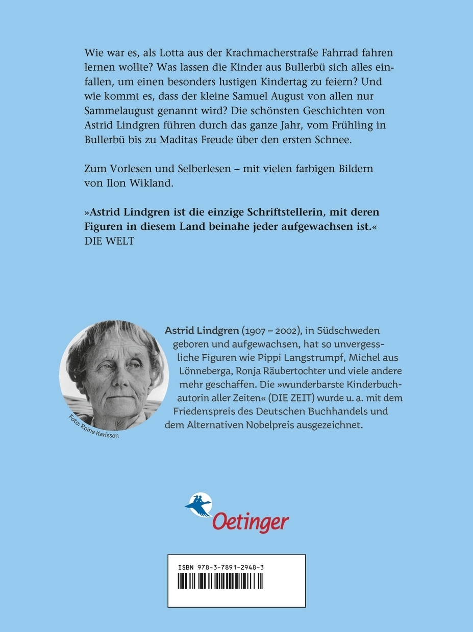 Vom Frühling in Bullerbü bis zu Maditas Freude über den ersten Schnee.Wie war es, als Lotta aus der Krachmacherstraße Fahrrad fahren lernen wollte? Was lassen die Kinder aus Bullerbü sich alles einfallen, um einen besonders lustigen Kindertag zu feiern? Und wie kommt es, dass der kleine Samuel August von allen nur Sammelaugust genannt wird? Zum Vorlesen und Selberlesen - mit vielen farbigen Bildern von Ilon Wikland.