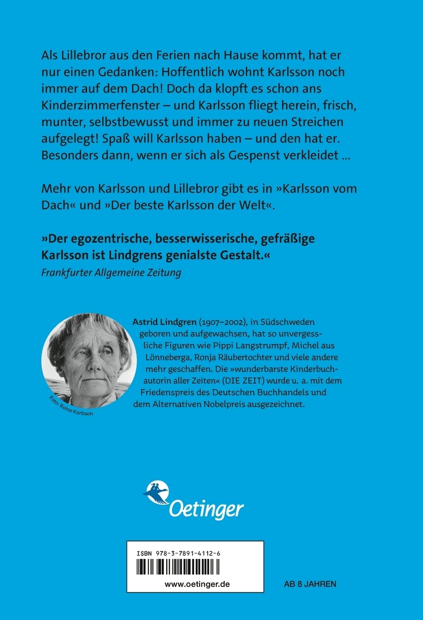 lt;p>Als Lillebror aus den Ferien nach Hause kommt, hat er nur einen Gedanken: Hoffentlich wohnt Karlsson noch immer auf dem Dach! Doch da klopft es schon ans Kinderzimmerfenster - und Karlsson fliegt herein, frisch, munter, selbstbewusst und immer zu neuen Streichen aufgelegt! Spaß will Karlsson haben - und den hat er. Besonders dann, wenn er sich als Gespenst verkleidet ...