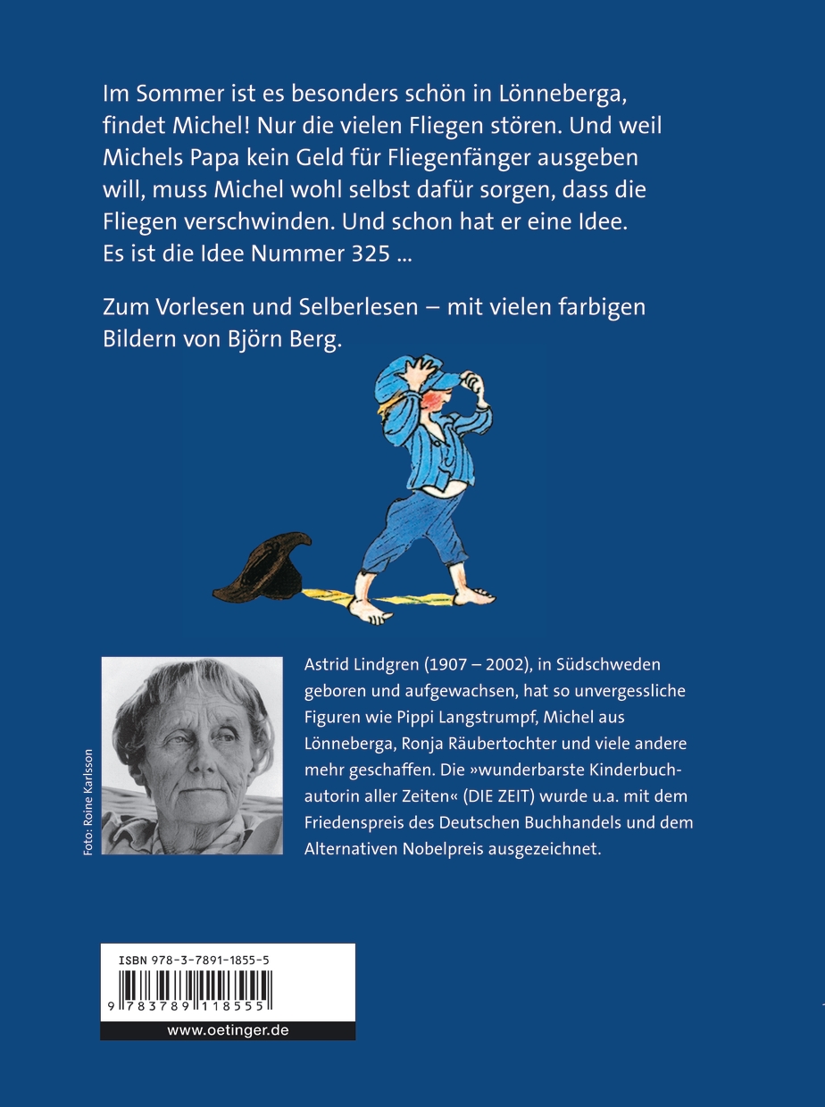 Im Sommer ist es besonders schön in Lönneberga, findet Michel! Nur die vielen Fliegen stören. Und weil Michels Papa kein Geld für Fliegenfänger ausgeben will, muss Michel wohl selbst dafür sorgen, dass die Fliegen verschwinden. Und dazu hat er eine Idee. Es ist die Idee Nummer 325 ... Zum Vorlesen und Selberlesen - mit vielen farbigen Bildern von Björn Berg.