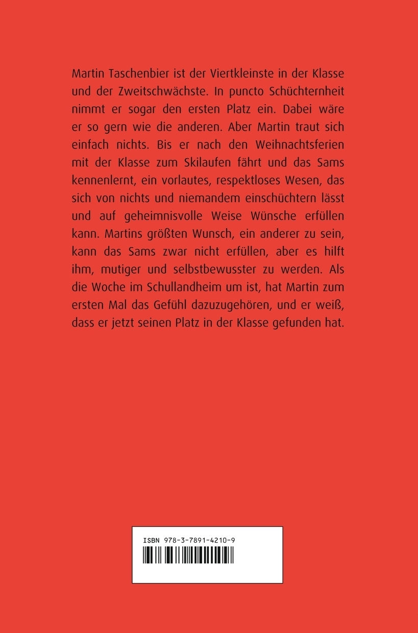 lt;p>Martin Taschenbier ist der Viertkleinste in der Klasse und der Zweitschwächste. In puncto Schüchternheit nimmt er sogar den ersten Platz ein. Dabei wäre er so gern wie die anderen. Aber Martin traut sich einfach nichts. Bis er nach den Weihnachtsferien mit der Klasse zum Skilaufen fährt und das Sams kennen lernt, ein vorlautes, respektloses Wesen, das sich von nichts und niemandem einschüchtern lässt und auf geheimnisvolle Weise Wünsche erfüllen kann. Martins größten Wunsch, ein anderer zu sein, kann das Sams zwar nicht erfüllen, aber es hilft ihm, mutiger und selbstbewusster zu werden. Als die Woche im Schullandheim um ist, hat Martin zum ersten Mal das Gefühl dazuzugehören, und er weiß, dass er jetzt seinen Platz in der Klasse gefunden hat.