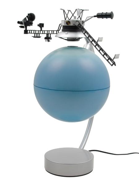 Über der Kugel befindet sich ein Modell der NASA Raumsonde "Voyager 2",