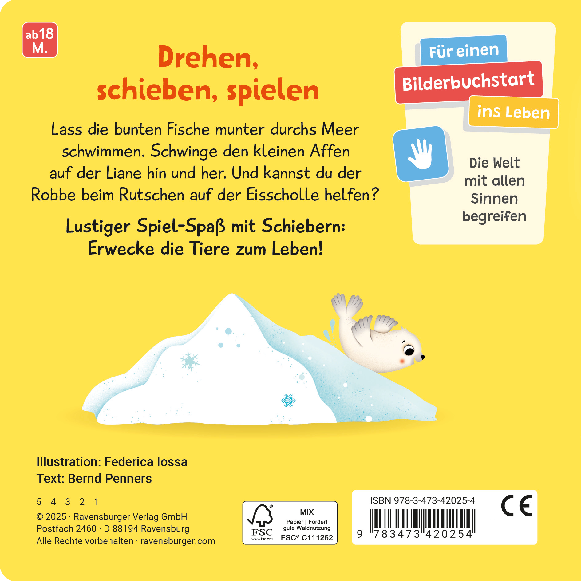 Wer hüpft und rutscht denn da? Bunte Fische kreisen im Meer. Das Äffchen schwingt sich von Ast zu Ast und der kleine Elefant wird von seinem Papa nass gespritzt. Auf jeder Seite gibt es ein großes Schiebe-Element, durch das die Tiere zum Leben erweckt werden. Mach mit und hilf der Robbe beim Rutschen auf der Eisscholle oder spring mit dem kleinen Bären über den Fluss. Der gereimte Text animiert zum Spielen mit den Schiebern. Die farbenfrohen Illustrationen zeigen spannende Szenen, in denen es viel zu entdecken gibt. Die Schieber auf den Seiten sind leichtgängig und stabil verbaut. So können bereits Kinder ab 18 Monaten die Elemente ganz eigenständig bewegen. Die Bücher sind robust, sodass die Kleinen auch lange Spaß beim Spielen haben. Durch zahlreiche Gucklöcher auf den Seiten können weitere Elemente entdeckt werden.