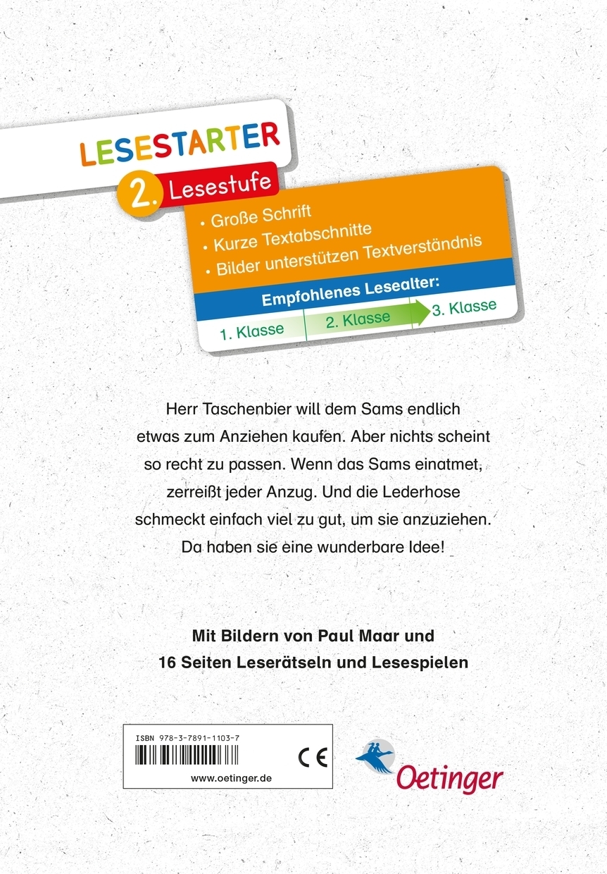 SAMSationell! Das erste Abenteuer vom Sams für Erstleser! Das Sams ist noch nicht lange bei Herrn Taschenbier, und etwas zum Anziehen hat es auch noch nicht. Im Kaufhaus suchen sie nach geeigneten Klamotten, aber kein Anzug, keine Lederjacke hält dem Sams stand: Alle Anzüge platzen, wenn das Sams ausatmet, und die Lederjacke isst das Sams kurzerhand auf. Da haben sie eine wunderbare Idee! Der erste Band der Serie mit den lustigsten Geschichten aus den Kinderbüchern vom Sams. Von Paul Maar selbst für Erstleser überarbeitet und illustriert. Die Lesestarter von Oetinger motivieren auch leseschwache Kinder zum Lesen. Wie? Mit bekannten Autoren, starken Charakteren und populären Themen, die Kinder im Alter von fünf bis zehn Jahren begeistern. Und mit vielen Bildern, Spielen und Leserätseln. Liebenswert, frech und typisch Sams! Mit ihm macht Lesenlernen einfach richtig Spaß.