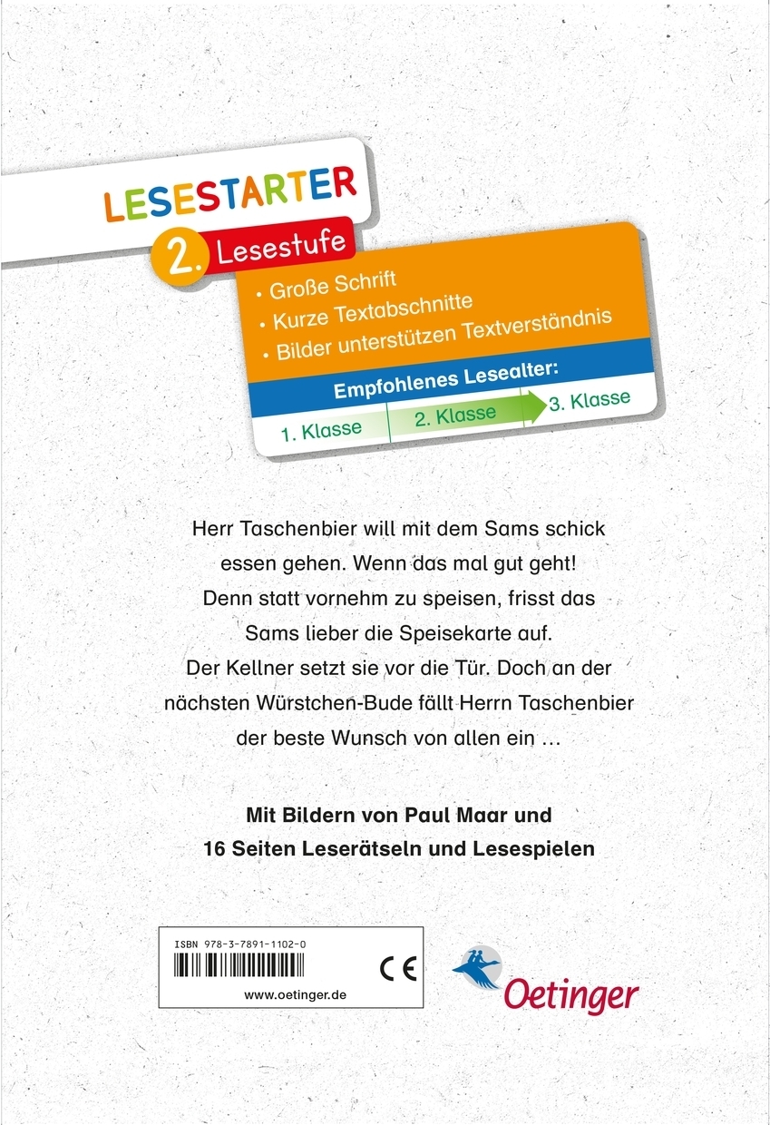 lt;p>Paul Maars Sams im feinen Restaurant? Wenn das mal gut geht! Herr Taschenbier will mit dem Sams schick essen gehen. Doch statt sich vornehm zu benehmen, frisst das Sams lieber die Speisekarte auf und streitet mit dem Kellner. Ruckzuck landen die zwei vor der Tür. An der nächsten Würstchenbude haben sie aber eine geniale Idee, wie sie doch noch das Essen der feinen Gesellschaft genießen können.
