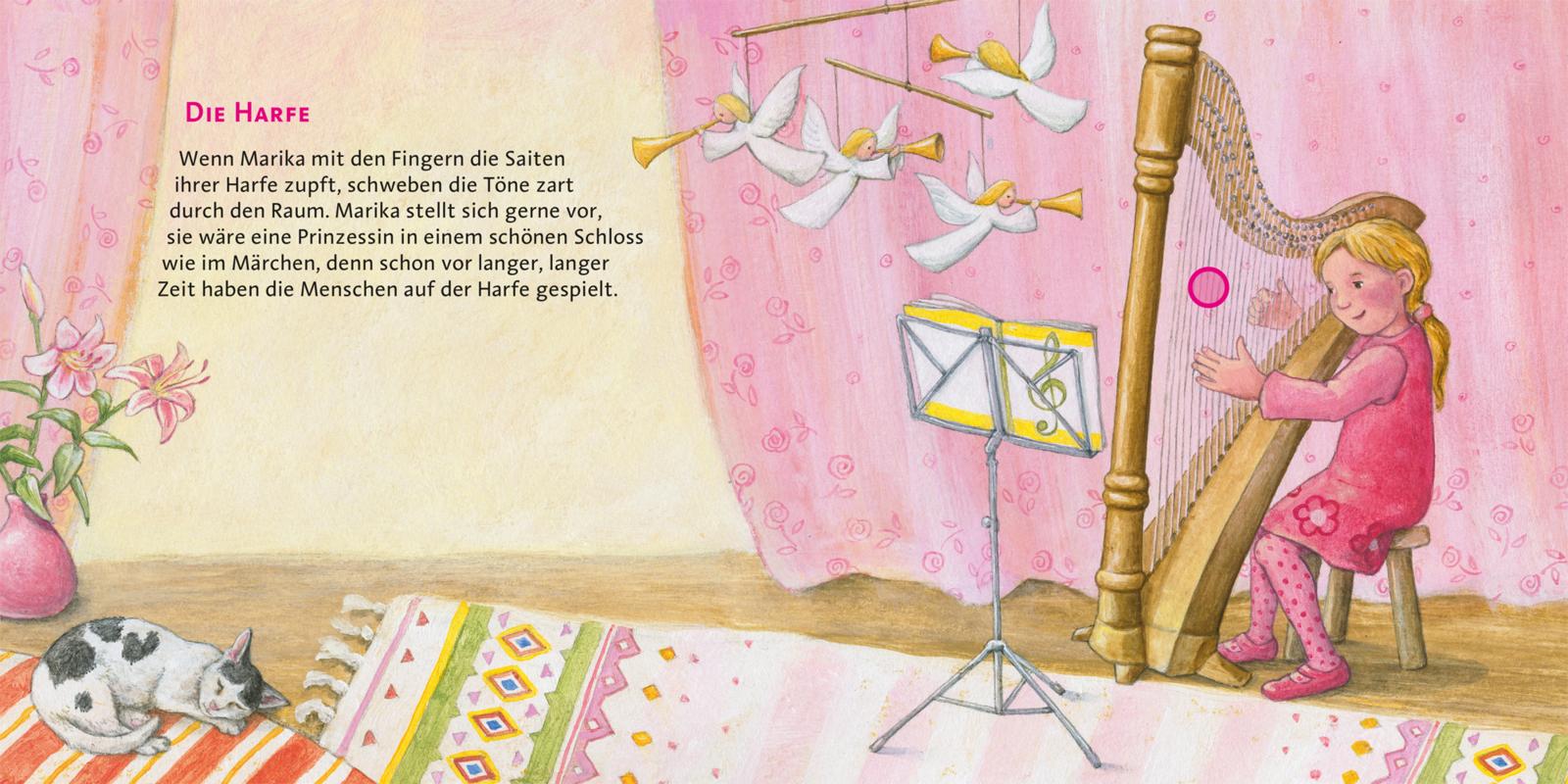 Entdecke wie sich Geige, Trompete, Harfe, Trommel, Flöte und Glockenspiel anhören. Ein kleiner Druck genügt und schon lassen sich die Instrumente zum Klingen bringen!
