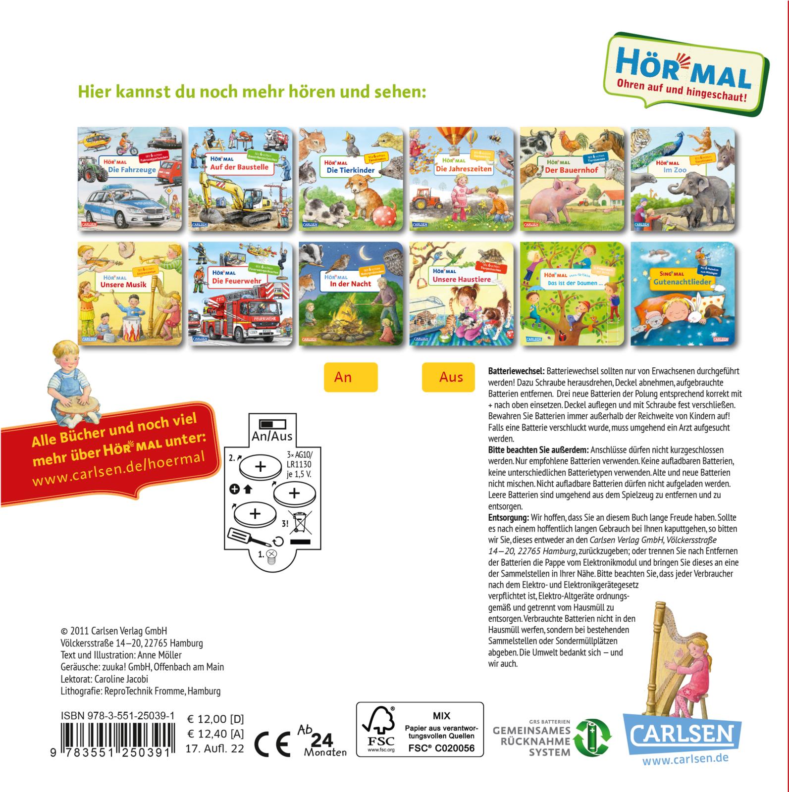 Typisch Hör mal: Jedes Buch enthält 6 leicht auslösbare Sounds mit einer Gesamtspielzeit von 60 Sekunden. Durch Druck auf die farbig markierten Punkte auf jeder Doppelseite werden die Geräusche aktiviert und deaktiviert. Kinder ab 2 Jahren können die Bücher problemlos alleine bedienen, bei jüngeren Kindern sollten die Eltern die Soundbuttons drücken, da die Feinmotorik und Kraft der kleinen Finger noch nicht ausreicht. Alle Titel der Reihe unterliegen strengen Sicherheitsanforderungen und Qualitätskontrollen. Jeder Soundknopf wird vor der Auslieferung auf seine Funktionsfähigkeit geprüft. Die Lautstärke der Sounds entspricht den Vorgaben der europäischen Spielzeugrichtlinie. Ausgeliefert werden die Bücher mit 3 handelsüblichen Knopfzell-Batterien LR 1130 mit je 1,5 V. Die Batterien lassen sich problemlos auswechseln. Dies ist zum Beispiel der Fall, wenn die Sounds nicht mehr die volle Spielzeit haben oder sich nur noch schwer auslösen lassen.