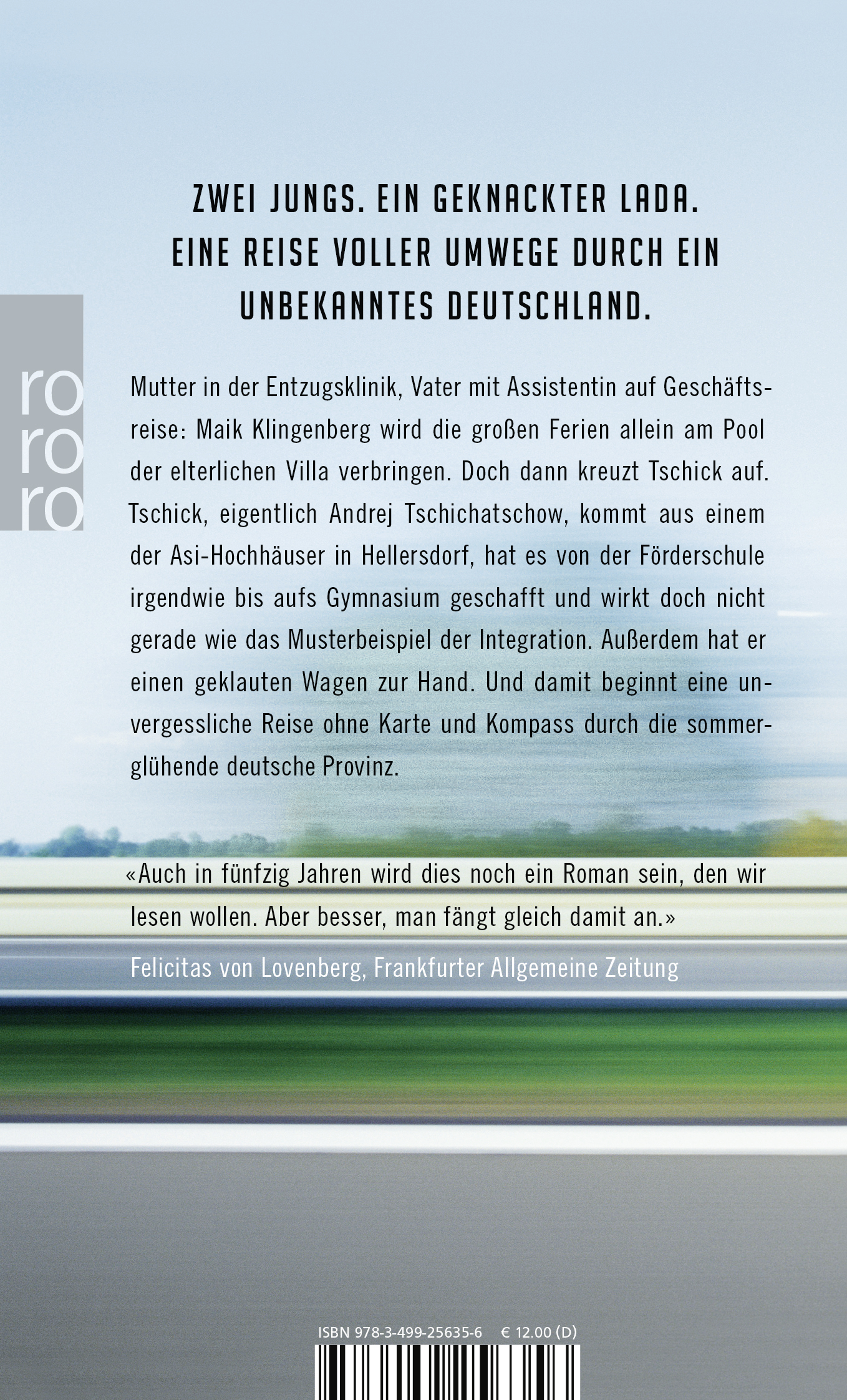 Mutter in der Entzugsklinik, Vater mit Assistentin auf Geschäftsreise: Maik Klingenberg wird die großen Ferien allein am Pool der elterlichen Villa verbringen. Doch dann kreuzt Tschick auf. Tschick, eigentlich Andrej Tschichatschow, kommt aus einem der Asi-Hochhäuser in Hellersdorf, hat es von der Förderschule irgendwie bis aufs Gymnasium geschafft und wirkt doch nicht gerade wie das Musterbeispiel der Integration. Außerdem hat er einen geklauten Wagen zur Hand. Und damit beginnt eine unvergessliche Reise ohne Karte und Kompass durch die sommer- glühende deutsche Provinz.