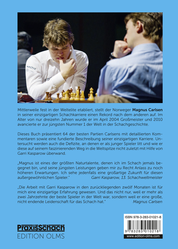 Dieses Buch präsentiert detaillierte Kommentare zu 64 der besten Partien Carlsens sowie eine Beschreibung seiner Karriere. Untersucht werden auch die Defizite, an denen er als junger Spieler litt und wie er diese auf dem Weg in die Weltspitze überwand.