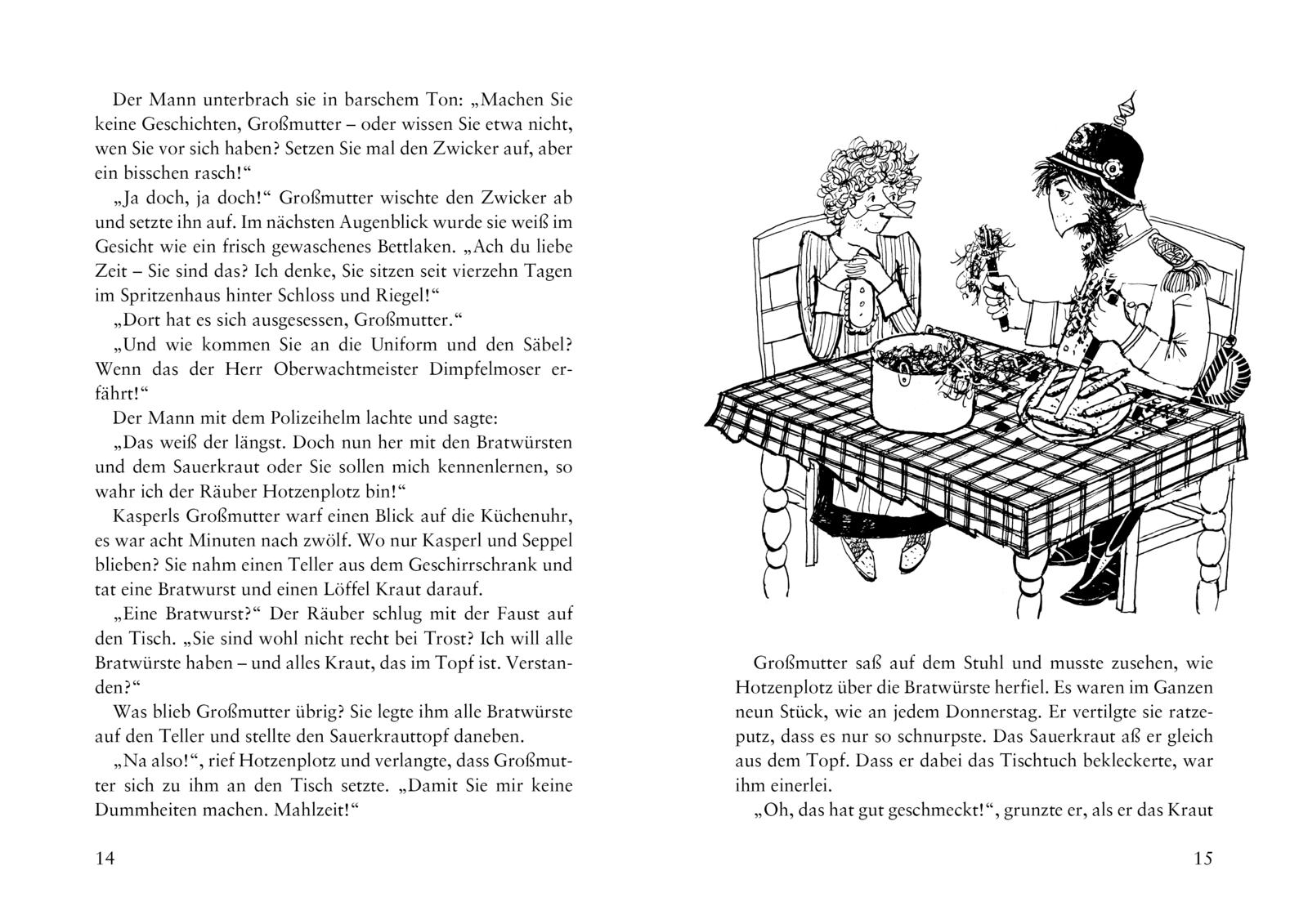 "In der Uniform des Polizeioberwachtmeisters Alois Dimpfelmoser radelte der Räuber Hotzenplotz mit Kasperls Großmutter auf dem gestohlenen Dienstfahrrad durch das schlummernde Städtchen. Großmutter saß im Damensitz auf dem Gepäckträger und hielt sich mit beiden Händen am Sattel fest. Anfangs war sie ein wenig ängstlich gewesen, doch allmählich begann ihr das Radfahren Spaß zu machen."