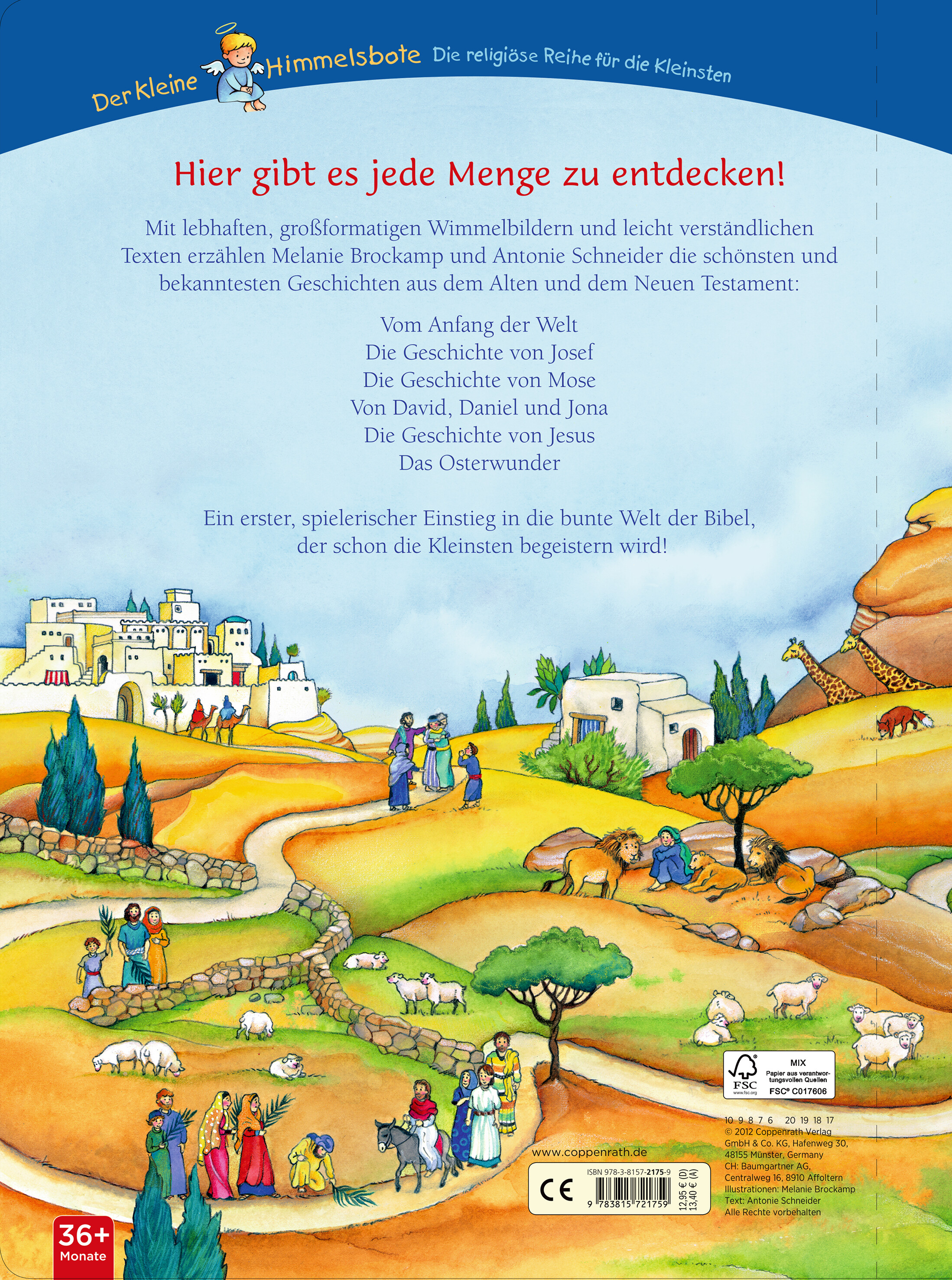 Mit lebhaften Wimmelbildern und kurzen, leicht verständlichen Texten erzählen Melanie Brockamp und Antonie Schneider 22 der schönsten und bekanntesten Geschichten aus dem Alten- und dem Neuen Testament – vom Anfang der Welt bis hin zum Ostermorgen und der Auferstehung. Das stabile Pappbilderbuch richtet sich an Kinder ab 3 Jahren und ist für beide Konfessionen geeignet. Mehr als 30 Motive laden zum Suchen und Entdecken ein und fördern ganz nebenbei Sehvermögen und Konzentrationsfähigkeit. Ein erster, spielerischer Einstieg in die bunte Welt der Bibel, der nicht nur die Kleinsten, sondern die ganze Familie begeistern wird.