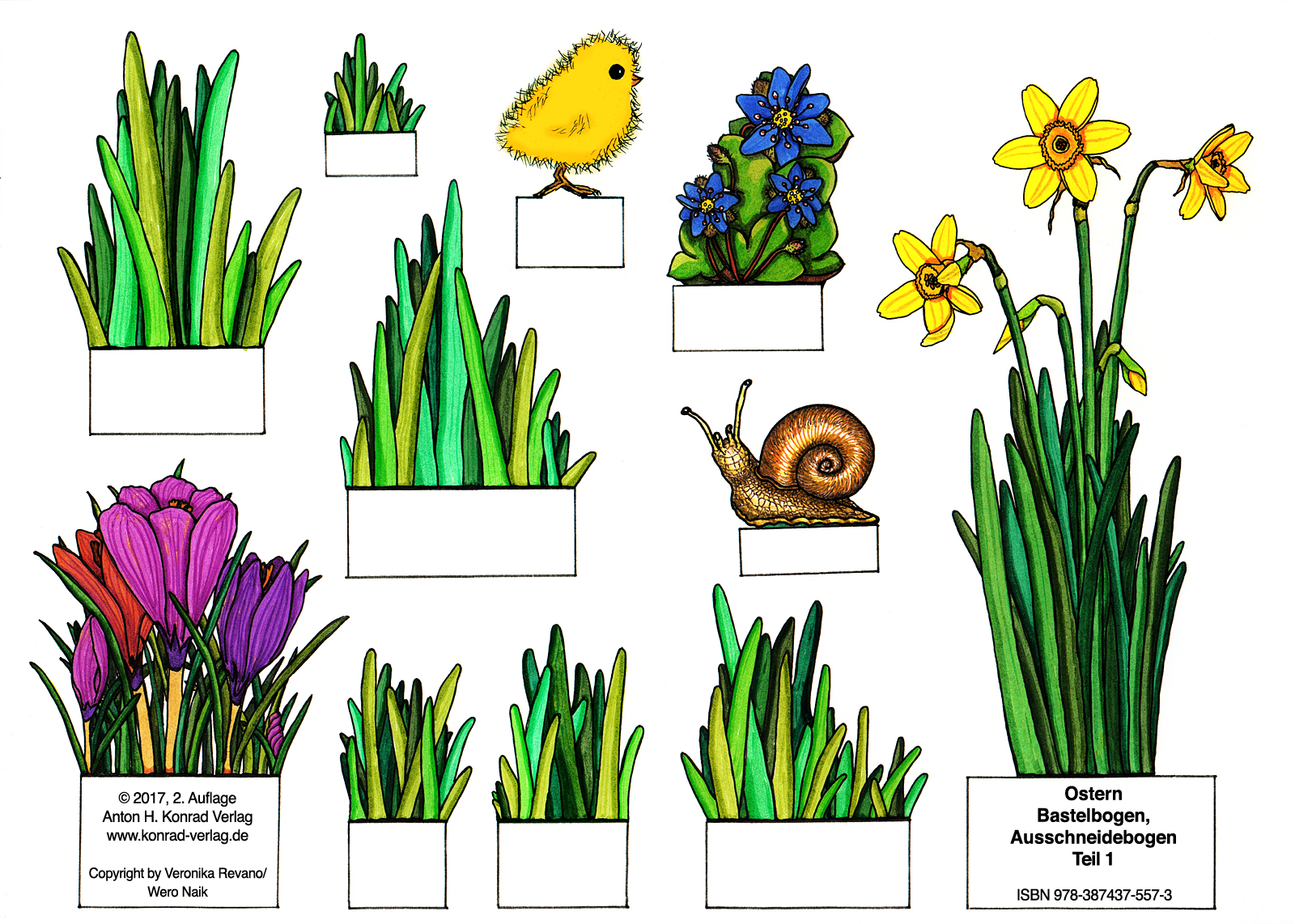 | Zusatzinfo | 6 Ostereier, 5 Tiere, 3 Blumen, 5 Grasbüschel zum Ausschneiden, 2 DIN A4 Kartonbogen in Klarsichtumschlag. |