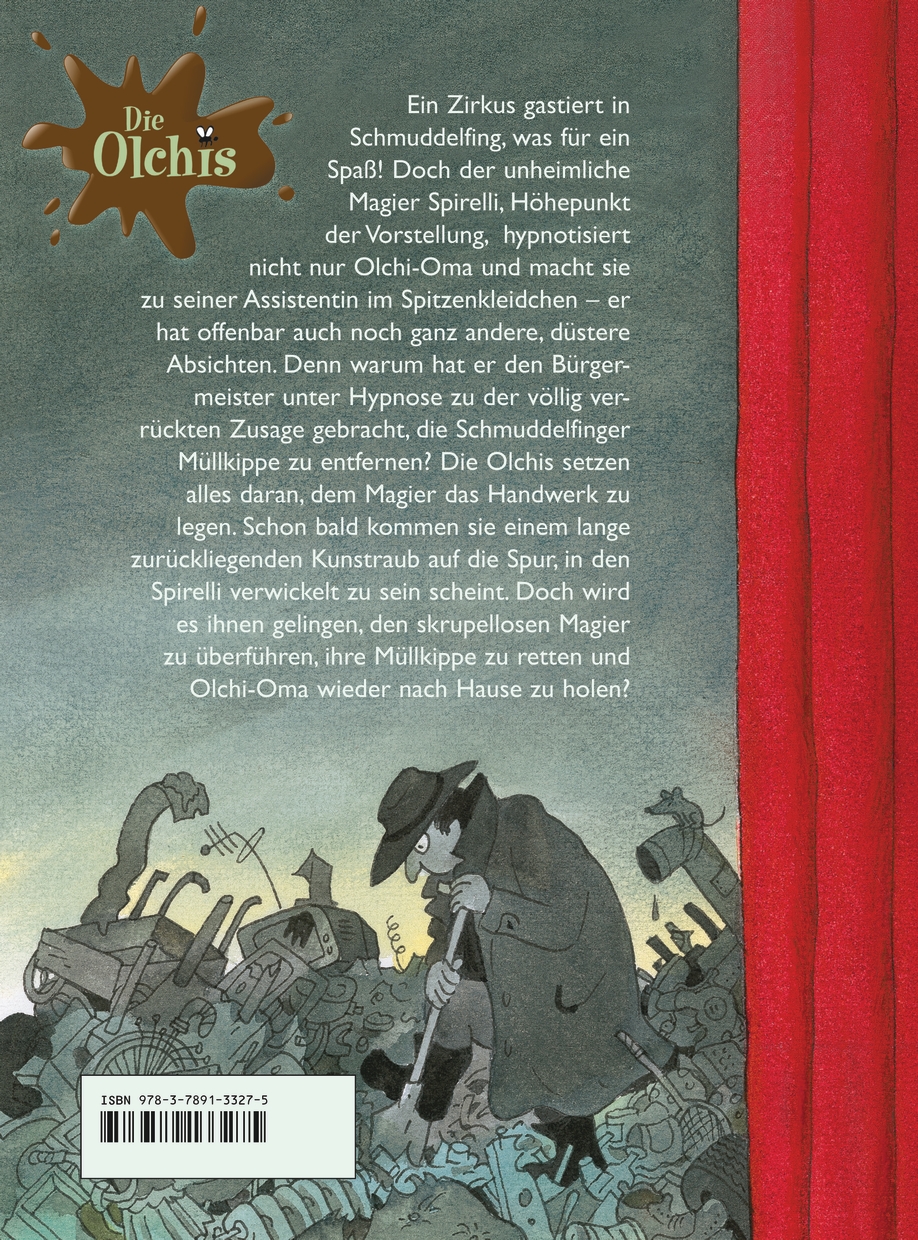 Ein Zirkus gastiert in Schmuddelfing, was für ein Spaß! Doch der unheimliche Magier hypnotisiert Olchi Oma und macht sie zu seiner Assistentin. Im Spitzenkleidchen! Außerdem will er dafür sorgen, dass die Müllkippe beseitig wird. Klar, dass die Olchis alles daran setzen, ihr Zuhause und ihre Oma zu retten. Mithilfe des genialen Professor Brausewein entdecken die Olchis, dass der Magier in einen ungeklärten Kunstraub verwickelt ist und dass die Beute irgendwo in Schmuddelfing vergraben sein soll. In diesem spannenden, witzigen, actionreichen und turbulenten Kinderroman von Erhard Dietl, mit vielen farbigen Illustrationen vom Autor, herrscht oberste Olchi-Alarmstufe!