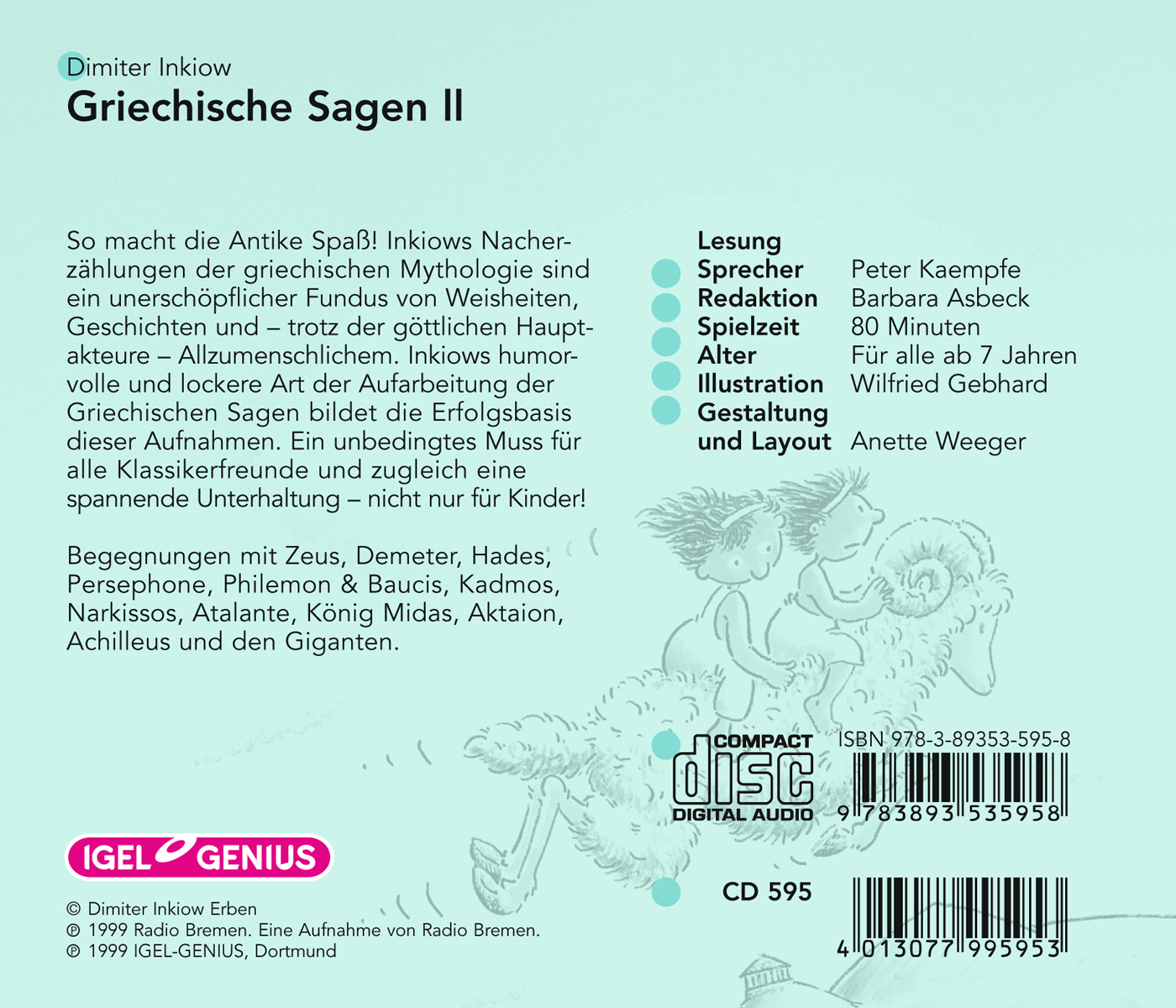 In gewohnter Qualität präsentiert Dimiter Inkiow weitere Schätze des griechischen Altertums: Die Zeiten der Urgötter - Zeus und die Bestrafung der Urmenschen - König Midas - Der Kampf der Giganten - Narziss - Das Goldene Vlies - Archilleus - Philemon und Baukis u.a.