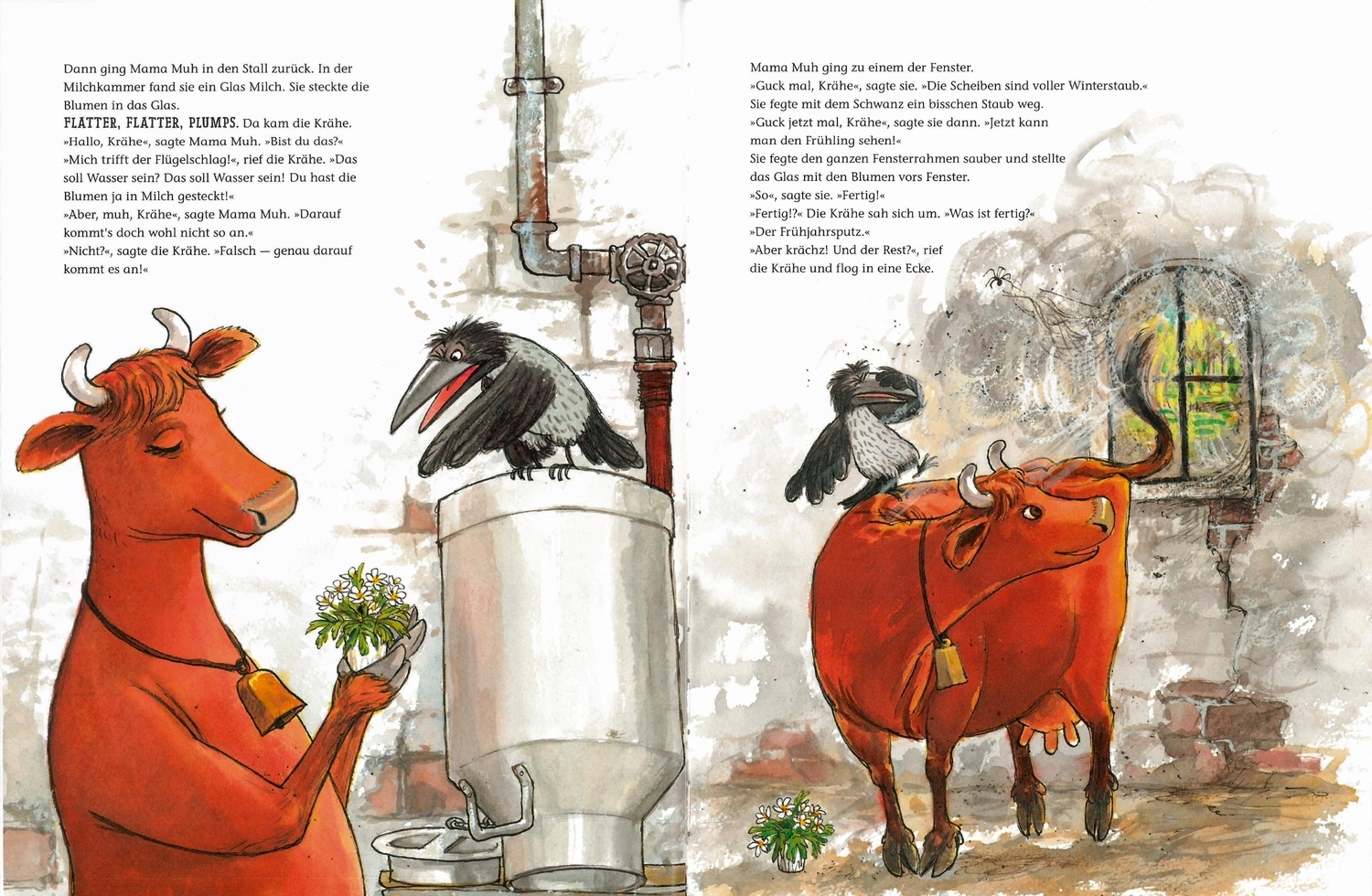 Warum sollte eine Kuh, die schaukeln, Schlitten fahren und ein Baumhaus bauen kann, nicht auch ihren Stall aufräumen? Ja, warum eigentlich nicht! Was tut eine ordentliche Kuh, wenn der letzte Schnee geschmolzen ist und die ersten Buschwindröschen blühen? Sie räumt auf, vor allem eine Kuh wie Mama Muh. Sie pflückt Blumen auf der Wiese, fegt mit ihrem Schwanz den Winterstaub vom Stallfenster, und dann sieht es im Kuhstall schon richtig frühlingshaft aus. Da ist die Krähe aus dem Krähenwald, die gerade ihr Krähennest aufgeräumt hat, aber ganz anderer Meinung. "Das soll Frühjahrsputz sein? Zupf mich an der Schwanzfeder?" ruft sie empört und zeigt Mama Muh und den anderen Kühen, wie man einen Kuhstall richtig aufräumt. Ohne allerdings die Kühe zu fragen, was sie von dieser Krähenordnung halten...