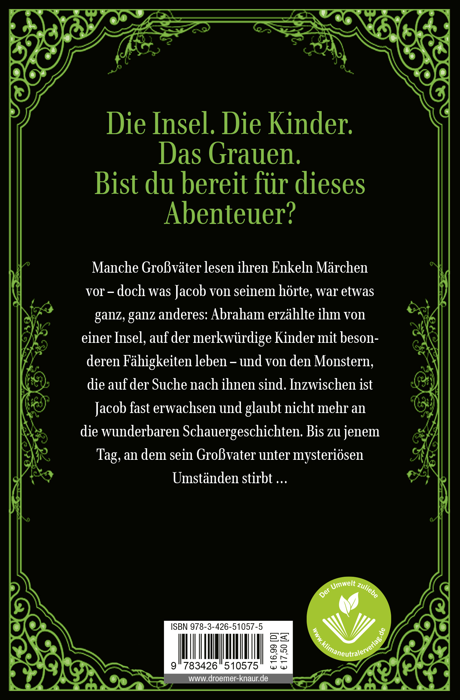 Manche Großeltern lesen ihren Enkeln Märchen vor. Aber was Jacob von seinem Opa hörte, war etwas ganz anderes: Abraham erzählte ihm von einer Insel, auf der abenteuerlustige Kinder mit besonderen Fähigkeiten leben, und von Monstern, die auf der Suche nach ihnen sind.