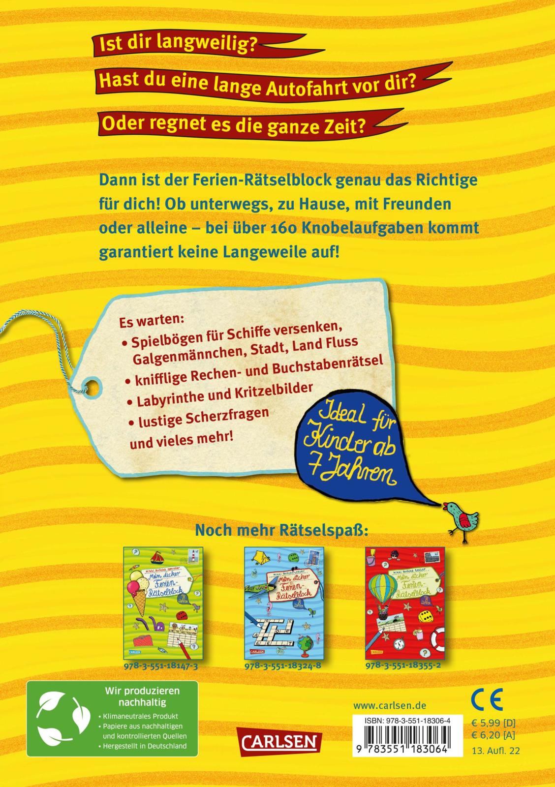 | Schlagworte | ab 8 Jahren • Autofahrt • Ferien • gegen Langeweile • Geschenke Kinder • Kinderbeschäftigung • Kinderbeschäftigung auf Reisen • Knobeln • Kritzelblock • Mitmachbuch • Quiz • Rätsel f. Kinder/Jugendliche; Papeterie • Reisespiele • Spielbuch Kinder • Spiel + Spaß • Urlaub |
