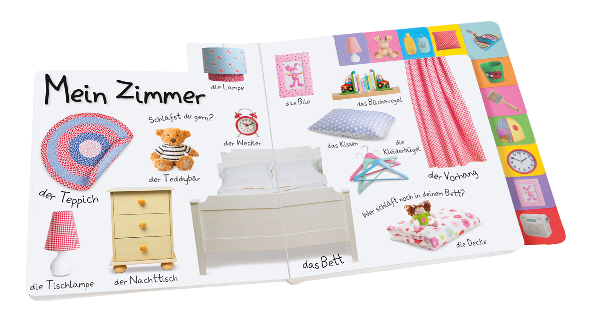Ob im Kinderzimmer, im Bad oder in der Küche - im eigenen Heim gibt es viele spannende Dinge! Dieses kunterbunte Lernbilderbuch begleitet Kleinkinder beim Spracherwerb und erweitert spielerisch ihren Wortschatz. Es führt die Kleinen durch jedes Zimmer und zeigt auf großen, bunten Fotos Gegenstände, die Kinder aus ihrem Alltag kennen. Durch das wiederholte Betrachten der Bilder und Vorsprechen der Wörter durch die Eltern lernen Kinder die Abbildungen zu benennen und ihren Wortschatz Tag für Tag zu erweitern. Eingestreute Fragen regen zum Mitdenken an. Praktische Griff-Register seitlich und oben wecken die Neugier und ermöglichen ein kinderleichtes Aufklappen und Suchen bestimmter Seiten