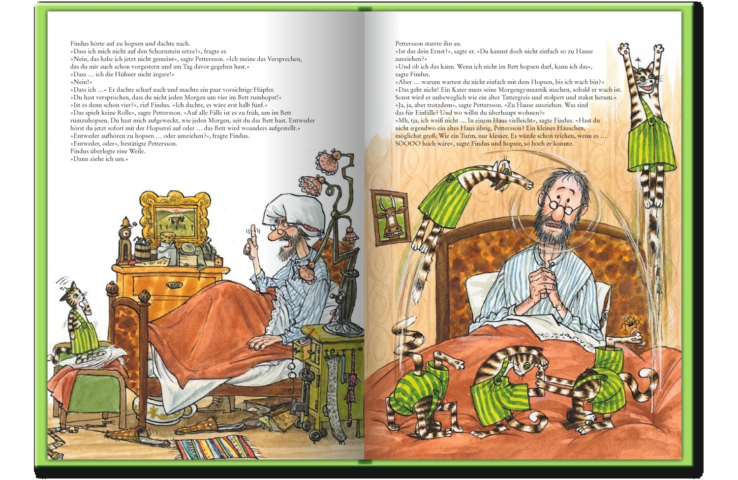 Hüpfen macht das Leben schöner! Wenn Findus aufwacht, muss er einfach auf seinem Bett hüpfen. Aber um vier Uhr morgens ist Pettersson davon nur genervt. Also entschließt sich Findus, ins Plumpsklo im Garten zu ziehen. Aber nachts ist es dort viel unheimlicher, als er dachte. Vielleicht ist es bei Pettersson doch schöner? Eine hinreißendes Bilderbuch von Pettersson und Findus - frisch aus dem Kinder- und Katerleben!