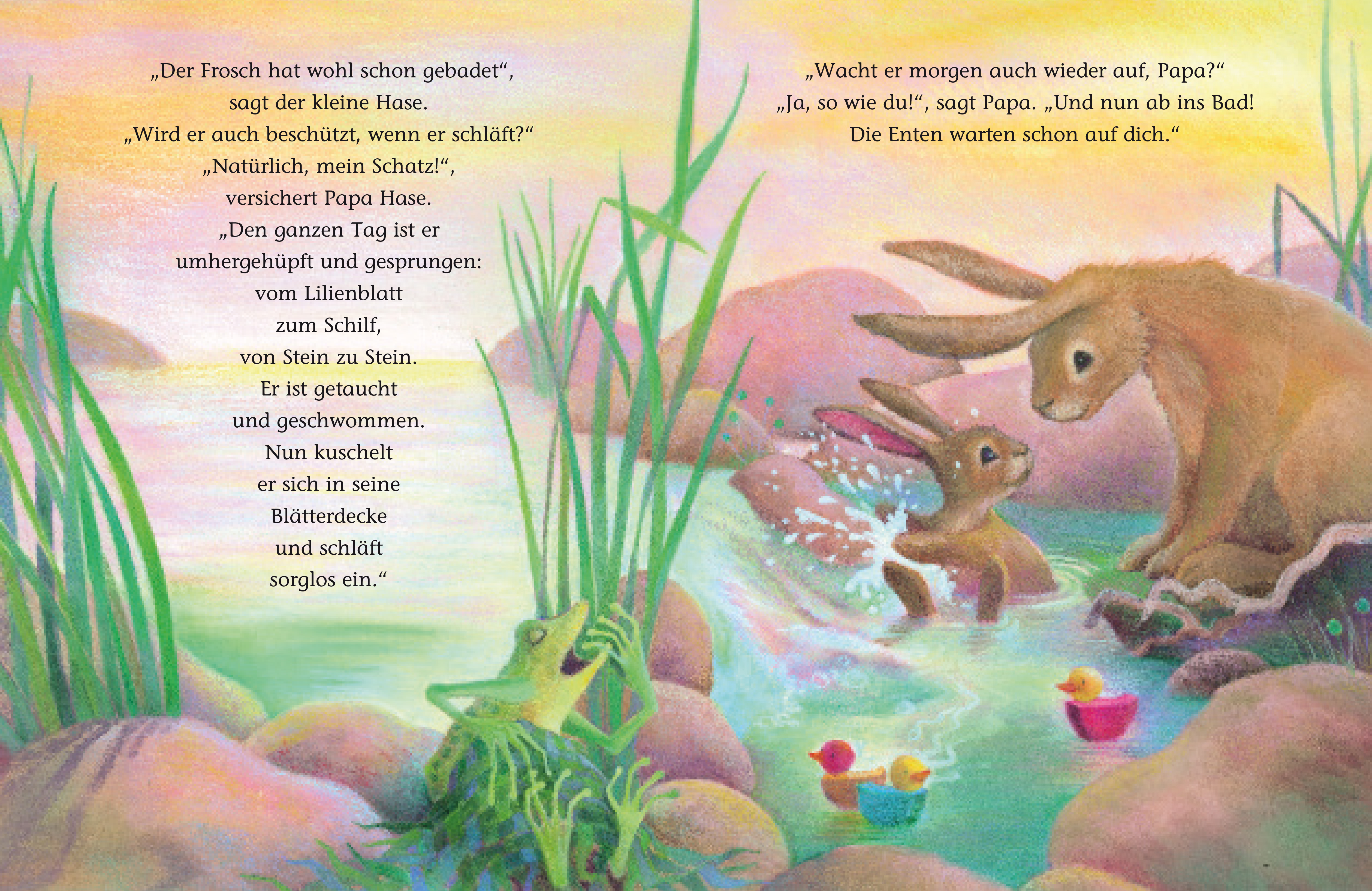 Den ganzen Tag hat der kleine Hase mit seinen Freunden gespielt und getobt. Nun ist es Schlafenszeit. Auf dem Heimweg begegnen dem Hasen viele andere Tiere, die ins Bett gebracht werden oder sich schlafen legen. Der kleine Hase fragt seine Eltern, ob sie auch alle in der Nacht beschützt werden. Die beruhigende Antwort lautet: "Ja, natürlich, so wie du!" Eine wunderschöne Geschichte über das Geheimnis von Liebe und Geborgenheit.