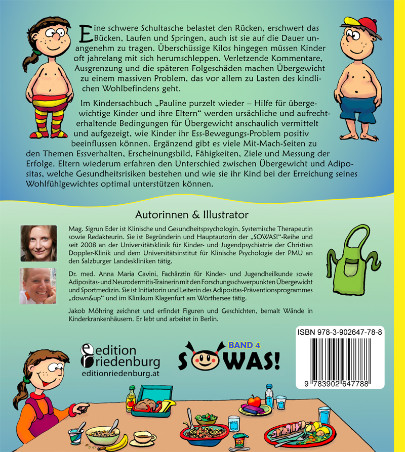 Liebe Kinder, liebe Eltern! Eine schwere Schultasche belastet den Rücken, erschwert das Bücken, Laufen und Springen, sie ist auch unangenehm zu tragen. Mit überschüssigen Kilos verhält es sich genauso. Der große Unterschied jedoch ist, dass viele Jungen und Mädchen sie ständig mit sich herumschleppen müssen. Kilos kann man nicht absetzen und in die Ecke stellen. Das ist auf Dauer ganz schön anstrengend, lässt Kinder sich in ihrer Haut unwohl fühlen und sorgt für schlechte Laune. Sport zu machen, sich gesund zu ernähren und über die eigenen Essgewohnheiten nachzudenken, fällt alleine besonders schwer. Meist halten Kinder das nur eine kurze Zeit durch. Um Erfolg zu haben, benötigen sie die volle Unterstützung ihrer Eltern und anderer, für sie wichtiger Bezugspersonen. Ein erster Schritt zum Wohlfühlgewicht, zu mehr Spaß an der Bewegung und zu guter Laune ist das gemeinsame Lesen des Buches. Viel Erfolg beim Durchstarten mit Pauline wünschen Sigrun Eder & Anna Maria Cavini