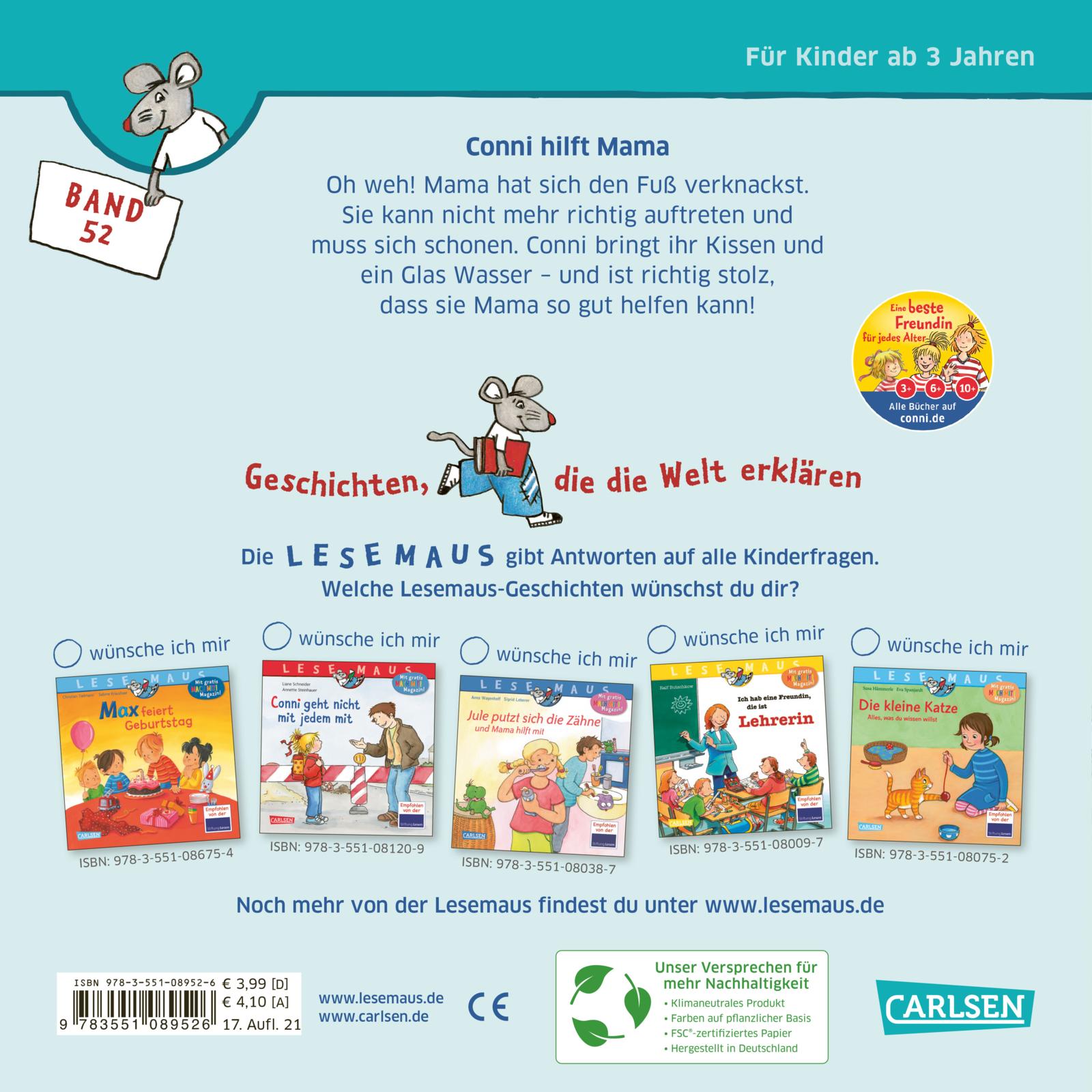 Auf dem Spielplatz steht eine Drehscheibe. Und die ist Schuld daran, dass Connis Mama sich den Fuß verknackst hat. Jetzt kann sie nicht mehr richtig auftreten und muss sich schonen. Aber Conni bringt ihr Kissen und ein Glas Wasser - und ist richtig stolz, dass sie Mama so gut helfen kann!