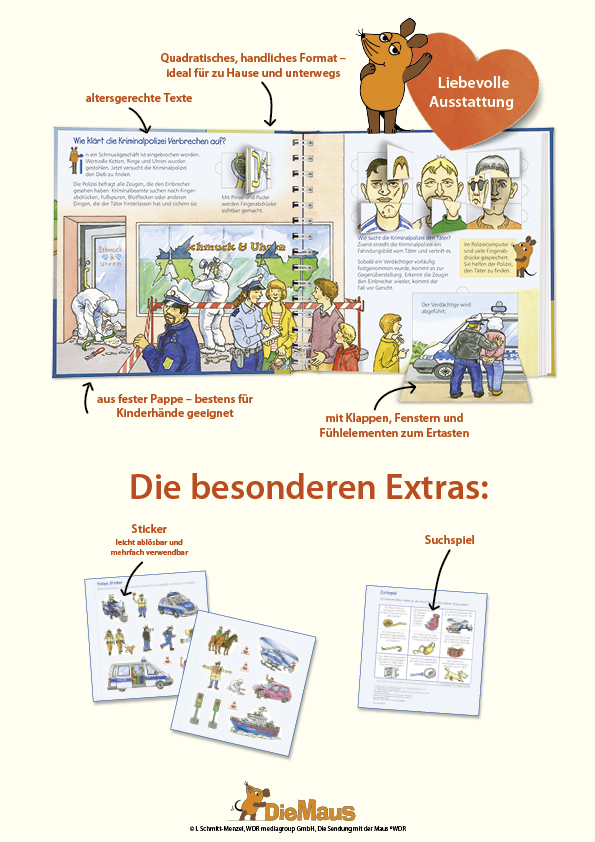 Tatütata, die Polizei ist da! Nur welche Aufgaben hat ein Polizeibeamter genau? Was passiert auf der Polizeiwache und wie wird ein Fahndungsbild erstellt? Die Maus war dabei und weiß jetzt, welche Ausrüstung ein Polizist braucht und was passiert, wenn ein Notruf eingeht. Mit den spannenden Polizei-Stickern können Kinder selbst auf Verbrecherjagd gehen.