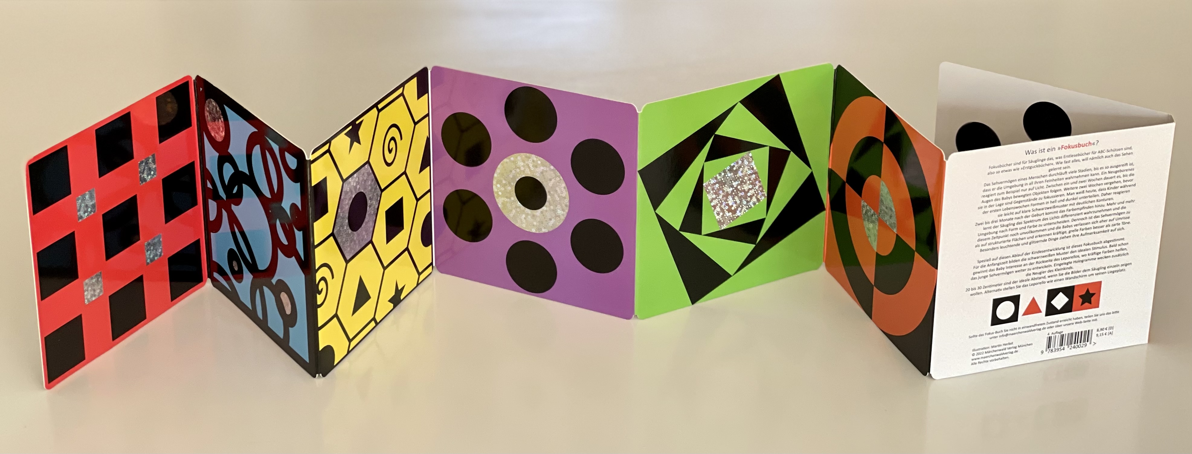 Was ist ein "Fokusbuch"?Fokusbücher sind für Säuglinge das, was Erstlesebücher für ABC-Schützen sind, also so etwas wie "Erstguckbücher". Wie fast alles, will nämlich auch das Sehen gelernt sein.Das Sehvermögen eines Menschen durchläuft viele Stadien, bis es so ausgereift ist, dass er die Umgebung in all ihren Feinheiten wahrnehmen kann. Ein Neugeborenes reagiert zum Beispiel nur auf Licht. Zwischen ein und zwei Wochen dauert es, bis die Augen des Babys bewegten Objekten folgen. Weitere zwei Wochen vergehen, bevor sie in der Lage sind Gegenstände zu fokussieren. Man weiß heute, dass Kinder während der ersten Lebenswochen Formen in hell und dunkel unterteilen. Daher reagieren sie leicht auf klare Schwarzweißmuster mit deutlichen Konturen.Zwei bis drei Monate nach der Geburt kommt das Farbempfinden hinzu. Mehr und mehr lernt der Säugling das Spektrum des Lichts differenziert wahrzunehmen und die Umgebung nach Form und Farbe zu unterscheiden. Dennoch ist das Sehvermögen zu diesem Zeitpunkt noch unvollkommen und die Babys verlassen sich eher auf Umrisse als auf strukturierte Flächen und erkennen kräftige, grelle Farben besser als zarte Töne. Besonders leuchtende und glitzernde Dinge ziehen ihre Aufmerksamkeit auf sich.Speziell auf diesen Ablauf der Kindesentwicklung ist dieses Fokusbuch abgestimmt. Für die Anfangszeit bilden die schwarzweißen Muster den idealen Stimulus. Bald schon gewinnt das Baby Interesse an der Rückseite des Leporellos, wo kräftige Farben helfen, das junge Sehvermögen weiter zu entwickeln. Eingelegte Hologramme wecken zusätzlich die Neugier des Kleinkinds.20 bis 30 Zentimeter sind der ideale Abstand, wenn Sie die Bilder dem Säugling einzeln zeigen wollen. Alternativ stellen Sie das Leporello wie einen Wandschirm um seinen Liegeplatz.