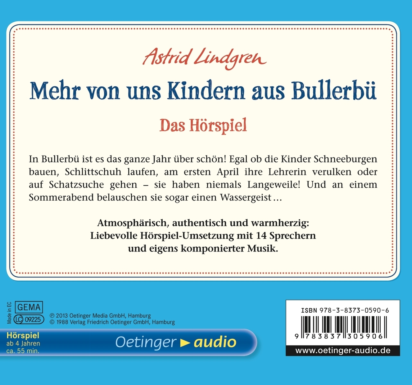 | Schlagworte | Abenteuer • Alltagsabenteuer • Astrid Lindgren • Bauernhof • Bullerbü • Bullerby • CD • Familie • Freizeit • Freunde • Freundschaft • Geschichten • Heile Welt • Hörbuch; Hörspiel für Kinder/Jugendliche • Hörspiel • hygge • Idylle • Kinder • Kinderalltag • Kinderbuch • Kinderbuch ab 4 • Klassiker • Landleben • lustig • naturverbunden • Nostalgie • Schnee • Schweden • Skandinavien • Sommer • Verfilmung • Weihnachten • Winter |