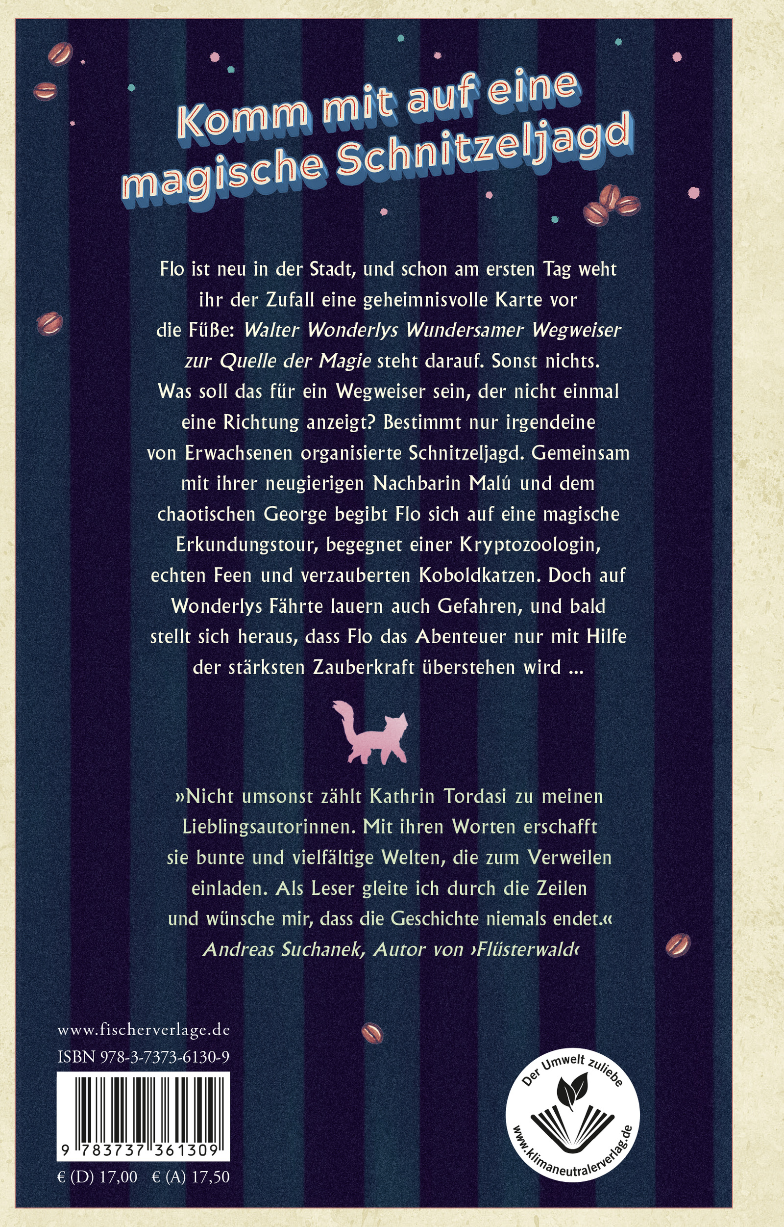 Flo ist neu in der Stadt, und schon am ersten Tag weht ihr der Zufall eine geheimnisvolle Schatzkarte vor die Füße: Walter Wonderly's Wundersamer Wegweiser zur Quelle der Magie steht darauf. Sonst nichts. Was soll das für ein Wegweiser sein, der nicht einmal eine Richtung anzeigt? Bestimmt nur irgendeine von Erwachsenen organisierte Schnitzeljagd. Gemeinsam mit ihrer neugierigen Nachbarin Malú und dem chaotischen George begibt Flo sich auf eine magische Erkundungstour, begegnet einer Kryptozoologin, echten Feen und verzauberten Koboldkatzen. Doch auf Wonderlys Fährte lauern auch Gefahren, und bald stellt sich heraus, dass Flo das Abenteuer nur mit Hilfe der stärksten Zauberkraft überstehen wird ...