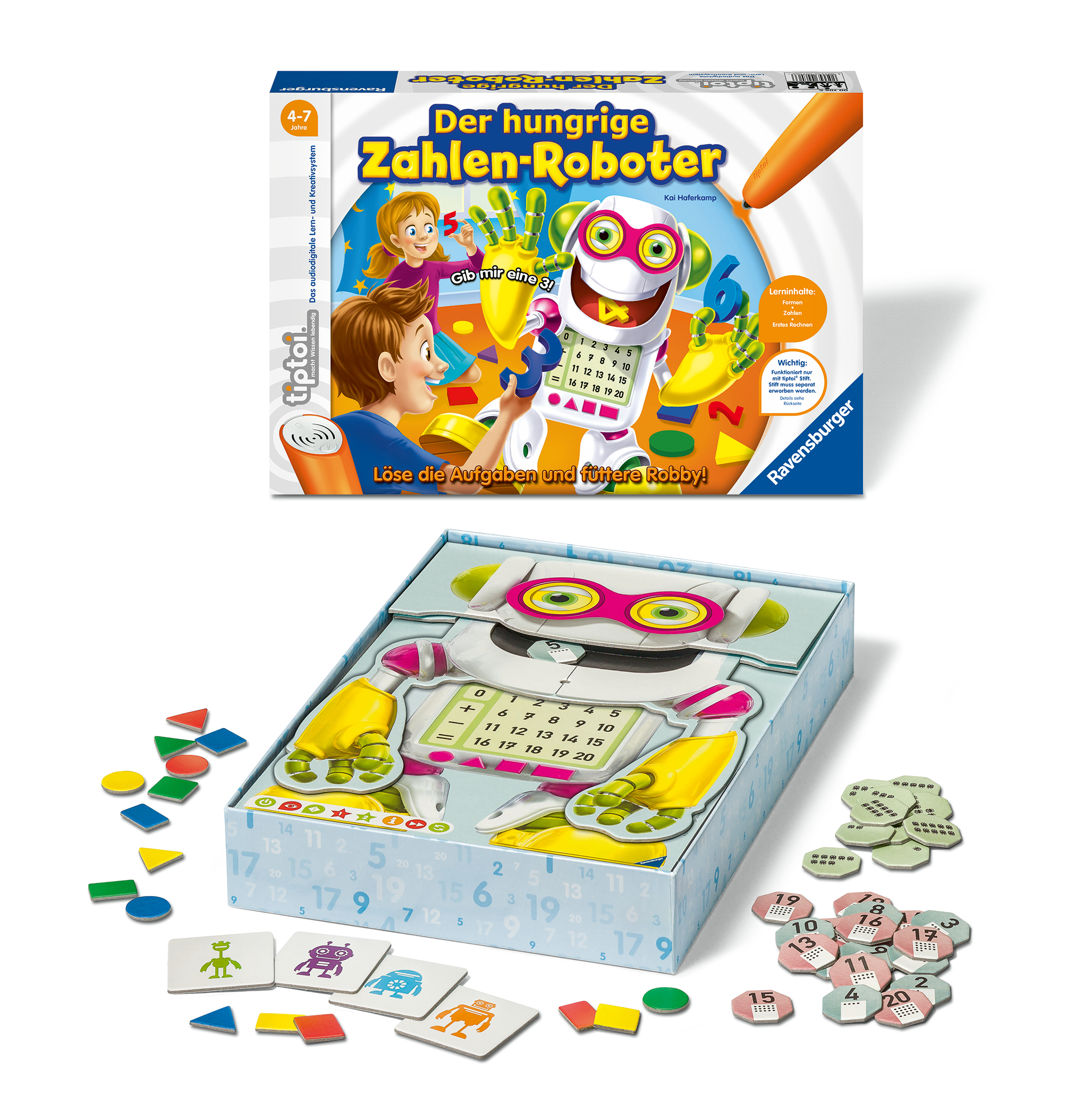 Faszinierende Spielmechanik – Robby „schluckt“ die richtigen Antworten Schrittweise Vermittlung in vier Schwierigkeitsstufen Formen, Zahlen und erstes Rechnen Was ist ein Dreieck? Wie sieht eine 4 aus? Was ist 5 + 2? Robby hat großen Hunger! Wenn die Kinder Robbys Aufgaben richtig lösen, legen sie den Chip in seinen Mund – und schwupps – ist er auch schon im Bauch des hungrigen Roboters verschwunden. Robby singt und lacht mit den angehenden Rechenkünstlern, hat viele lustige Spiele auf Lager und wird sogar zum Taschenrechner. Spiel-Inhalt: 3 Stanztafeln Robby mit beweglichem Mund, 50 Zahlen- und Formen-Chips, 4 Spielertafeln tiptoi® Stift nicht enthalten, muss separat erworben werden . Spieleranzahl: 4-1. Spieldauer: 20 Min. Spieleanleitung in deutsch.