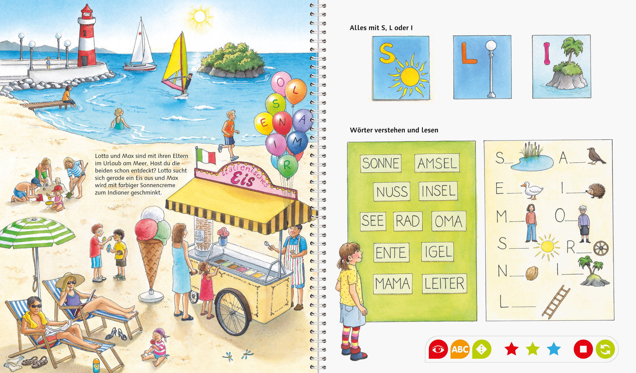 Auf allen Seiten warten abwechslungsreiche Spiele und Aufgaben: Buchstaben und Wörter suchen, Laute zuordnen, Reimwörter und Silben hören und Geräusche raten. In immer neuen Spielvarianten wird die Sprachbewusstheit gefördert und so ideal auf das Lesen- und Schreibenlernen in der Schule vorbereitet.