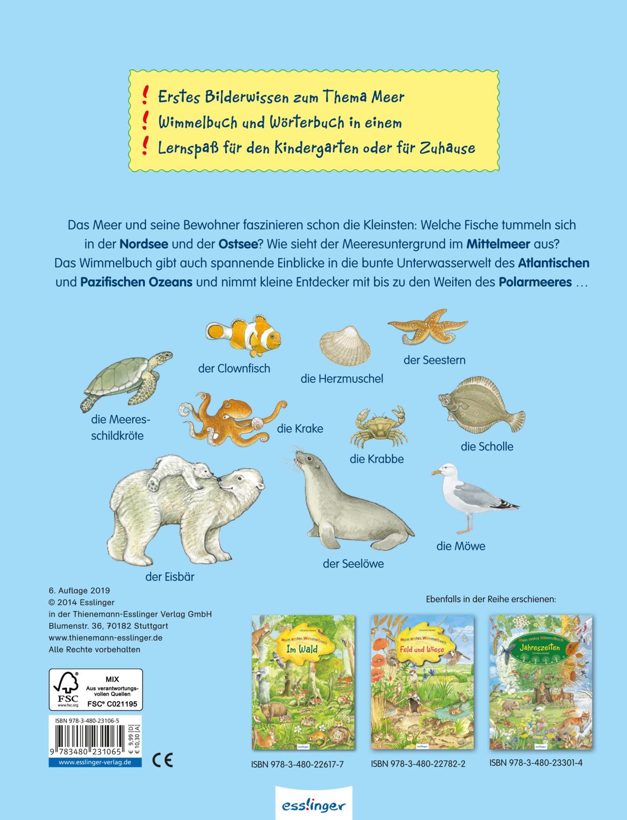 Welche Fische tummeln sich in der Nordsee und der Ostsee? Wie sieht der Meeresuntergrund im Mittelmeer aus? Das Wimmelbuch gibt auch den Kleinsten spannende Einblicke in die bunte Unterwasserwelt des Atlantischen und Pazifischen Ozeans und nimmt kleine Entdecker mit bis zu den Weiten des Polarmeeres. Auf den Bild-Wort-Leisten kann man sich viele Tiere noch einmal im Detail anschauen und deren Namen lernen. Es gibt viel zu entdecken, Augen auf und los!