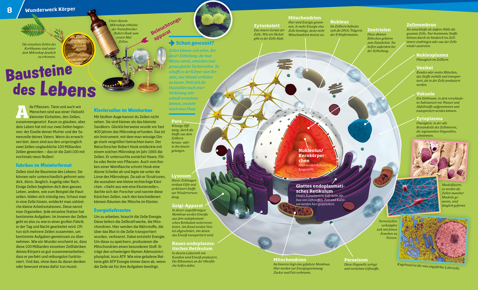 Wenn du als winziges Teilchen durch deinen Körper reisen könntest, würdest du über die fantastische Welt staunen, die von der Natur in Millionen von Jahren geschaffen wurde. Eine unvorstellbar lange Zeit verging, bis aus einzelnen Zellen erstaunliche Tiere und schließlich sogar das Wunder "Mensch" hervorgingen. Verglichen mit kosmischen Zeiträumen sind wir Menschen noch ziemlich grün hinter den Ohren. Unser Heimatplanet entstand vor ungefähr 4,6 Milliarden Jahren, vor zwei Milliarden Jahren entwickelten sich die ersten Zellen. Gerade einmal 200 000 Jahre alt ist unser direkter Urahn - der Homo sapiens. Er sah dem heutigen Menschen schon ziemlich ähnlich. WAS IST WAS nimmt uns mit auf diese faszinierende Reise und beschreibt das Gerüst des menschlichen Körpers, die Kommandozentrale "Gehirn", unsere "Tore in die Welt" wie Auge, Nase und Co, lebenswichtige Systeme und den Bauplan unseres Lebens.