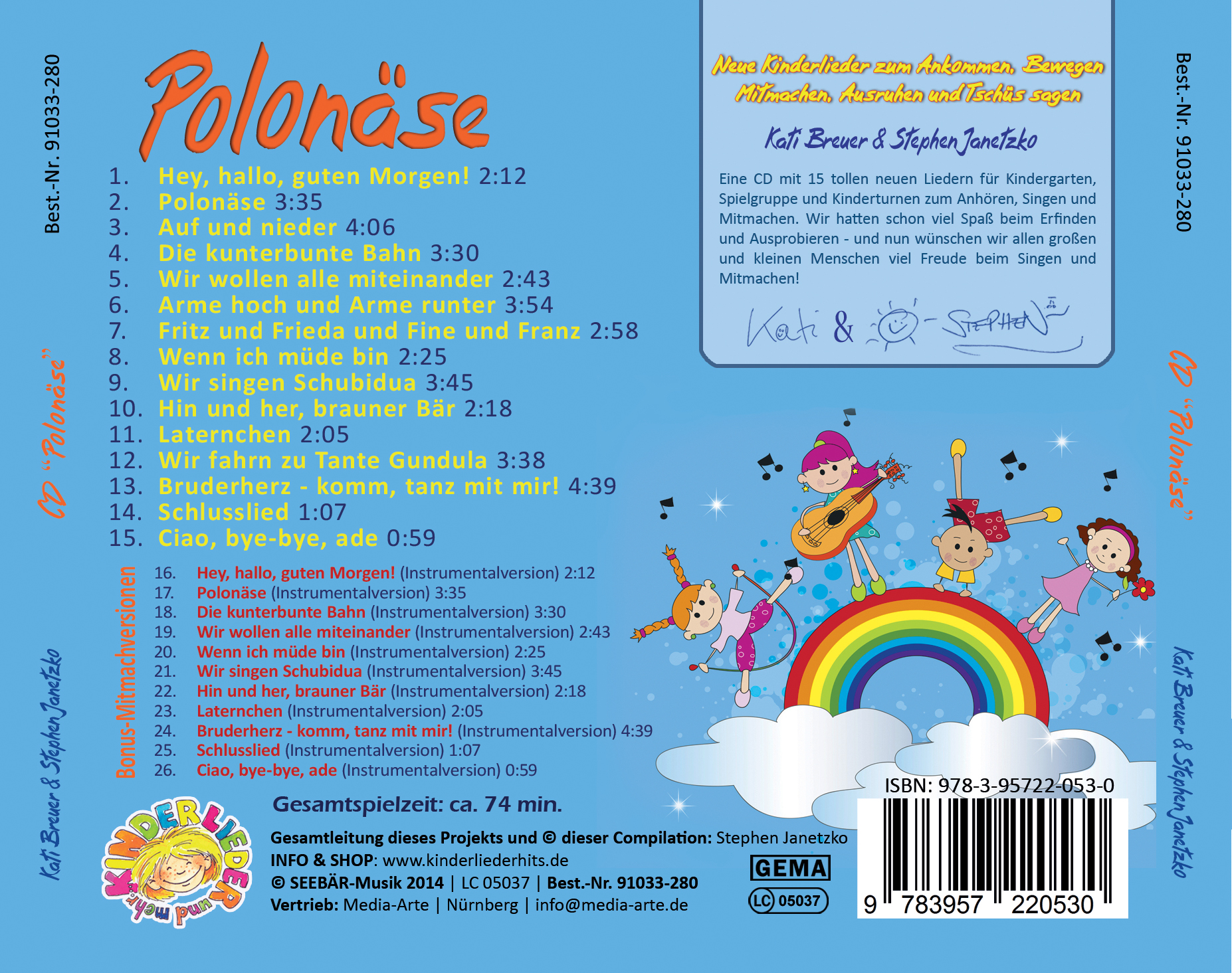 Alle Lieder der CD:1. Hey, hallo, guten Morgen!2. Polonäse3. Auf und nieder4. Die kunterbunte Bahn5. Wir wollen alle miteinander6. Arme hoch und Arme runter (Ich dreh mich um mich selbst im Kreis)7. Fritz und Frieda und Fine und Franz8. Wenn ich müde bin9. Wir singen Schubidua10. Hin und her, brauner Bär11. Laternchen (Laternchen-Lied)12. Wir fahrn zu Tante Gundula13. Bruderherz - komm, tanz mit mir!14. Schlusslied (Auf Wiedersehn, auf Wiedersehn!)15. Ciao, bye-bye, adeBonus-Instrumentalversionen:16. Hey, hallo, guten Morgen! (Instrumentalversion)17. Polonäse (Instrumentalversion)18. Die kunterbunte Bahn (Instrumentalversion)19. Wir wollen alle miteinander (Instrumentalversion)20. Wenn ich müde bin (Instrumentalversion)21. Wir singen Schubidua (Instrumentalversion)22. Hin und her, brauner Bär (Instrumentalversion)23. Laternchen (Instrumentalversion)24. Bruderherz - komm, tanz mit mir! (Instrumentalversion)25. Schlusslied (Instrumentalversion)26. Ciao, bye-bye, ade (Instrumentalversion)Enthält zusätzlich 11 Instrumentalfassungen auf der CD sowie ein 16-seitiges Booklet mit allen Noten, Gitarrengriffen, Liedtexten und Spielanregungen.