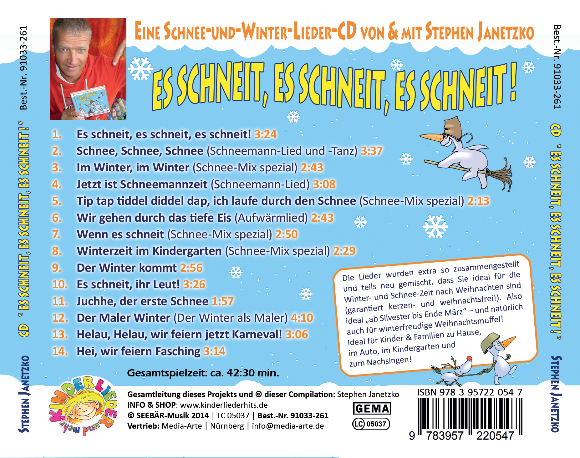 Viele neue Schnee-Lieder zum Mitsingen, Tanzen und Anhören für Winter und Fasching. Eine Schnee-und-Winter-Lieder-CD von und mit Stephen Janetzko. Die Lieder wurden extra so zusammengestellt und teils neu gemischt, dass Sie ideal für die Winter- und Schnee-Zeit nach Weihnachten sind (garantiert kerzen- und weihnachtsfrei!). Also ideal von Neujahr bis Ende März – und natürlich auch für winterfreudige Weihnachtsmuffel! Ideal für Kinder & Familien zu Hause, im Auto, im Kindergarten, zum Nachsingen! Inhalt: 1. Es schneit, es schneit, es schneit! 3:24 2. Schnee, Schnee, Schnee (Schneemann-Lied und -Tanz) 3:37 3. Im Winter, im Winter (Schnee-Mix spezial) 2:43 4. Jetzt ist Schneemannzeit (Schneemann-Lied) 3:08 5. Tip tap tiddel diddel dap, ich laufe durch den Schnee (Schnee-Mix spezial) 2:13 6. Wir gehen durch das tiefe Eis (Aufwärmlied) 2:43 7. Wenn es schneit (Schnee-Mix spezial) 2:50 8. Winterzeit im Kindergarten (Schnee-Mix spezial) 2:29 9. Der Winter kommt 2:56 10. Es schneit, ihr Leut! 3:26 11. Juchhe, der erste Schnee 1:57 12. Der Maler Winter (Der Winter als Maler) 4:10 13. Helau, Helau, wir feiern jetzt Karneval! 3:06 14. Hei, wir feiern Fasching 3:14 Gesamt-Spieldauer ca. 42:30 DIESE NEUAUSGABE VON 2014 ENTHÄLT EIN AUSFÜHRLICHES 16-seitiges BOOKLET MIT ALLEN TEXTEN, NOTEN UND GITARRENGRIFFEN!!!