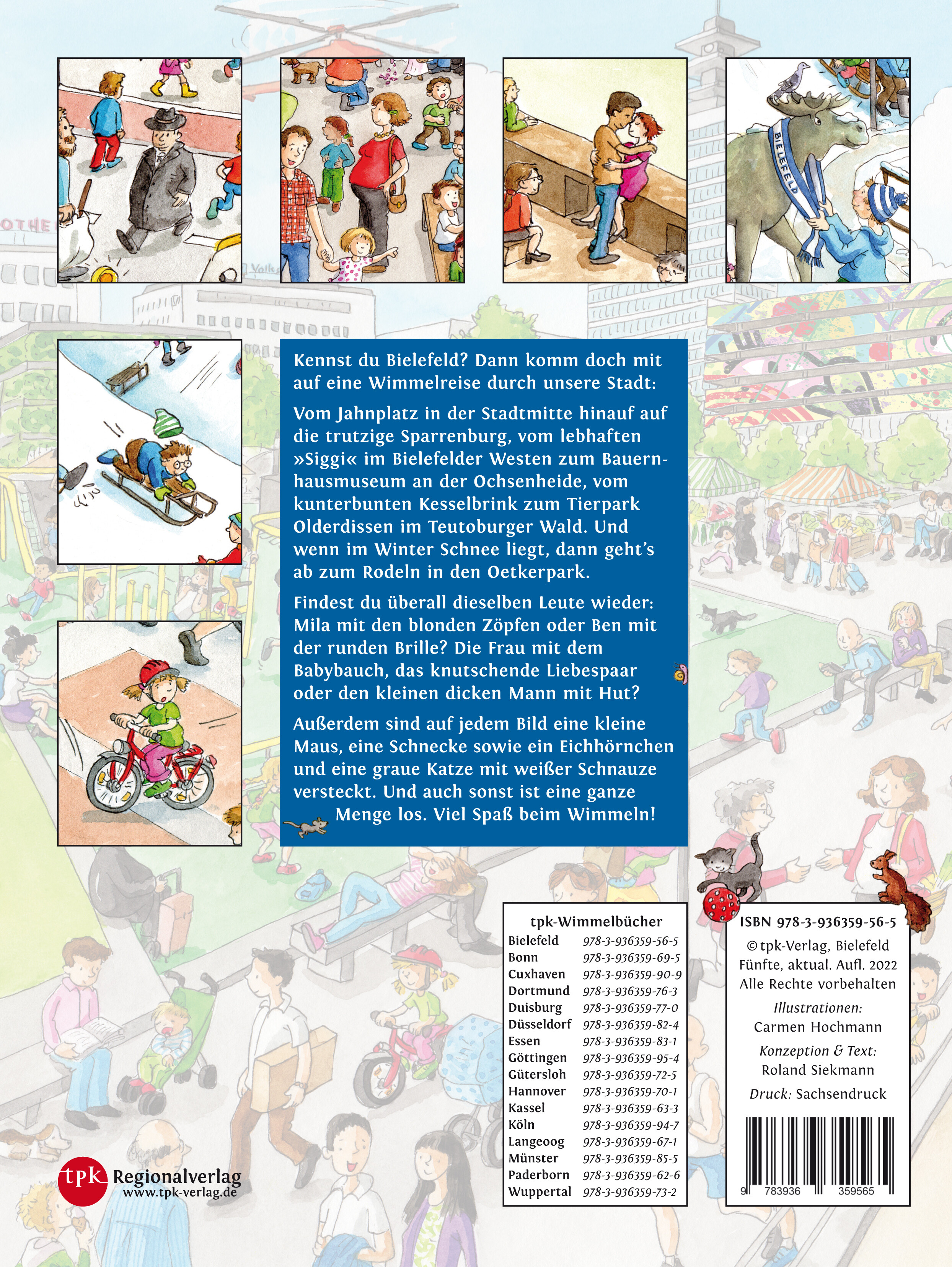 Kennst du Bielefeld? Dann komm doch mit auf eine Wimmelreise durch unsere Stadt: Vom Jahnplatz in der Stadtmitte hinauf auf die trutzige Sparrenburg, vom lebhaften »Siggi« im Bielefelder Westen zum Bauernhausmuseum an der Ochsenheide, vom kunterbunten Kesselbrink zum Tierpark Olderdissen im Teutoburger Wald. Und wenn im Winter Schnee liegt, dann geht's ab zum Rodeln in den Oetkerpark.Findest du überall dieselben Leute wieder: Mila mit den blonden Zöpfen oder Ben mit der runden Brille? Die Frau mit dem Babybauch, das knutschende Liebespaar oder den kleinen dicken Mann mit Hut? Außerdem sind auf jedem Bild eine kleine Maus, eine Schnecke sowie ein Eichhörnchen und eine graue Katze mit weißer Schnauze versteckt. Und auch sonst ist eine ganze Menge los. Viel Spaß beim Wimmeln!