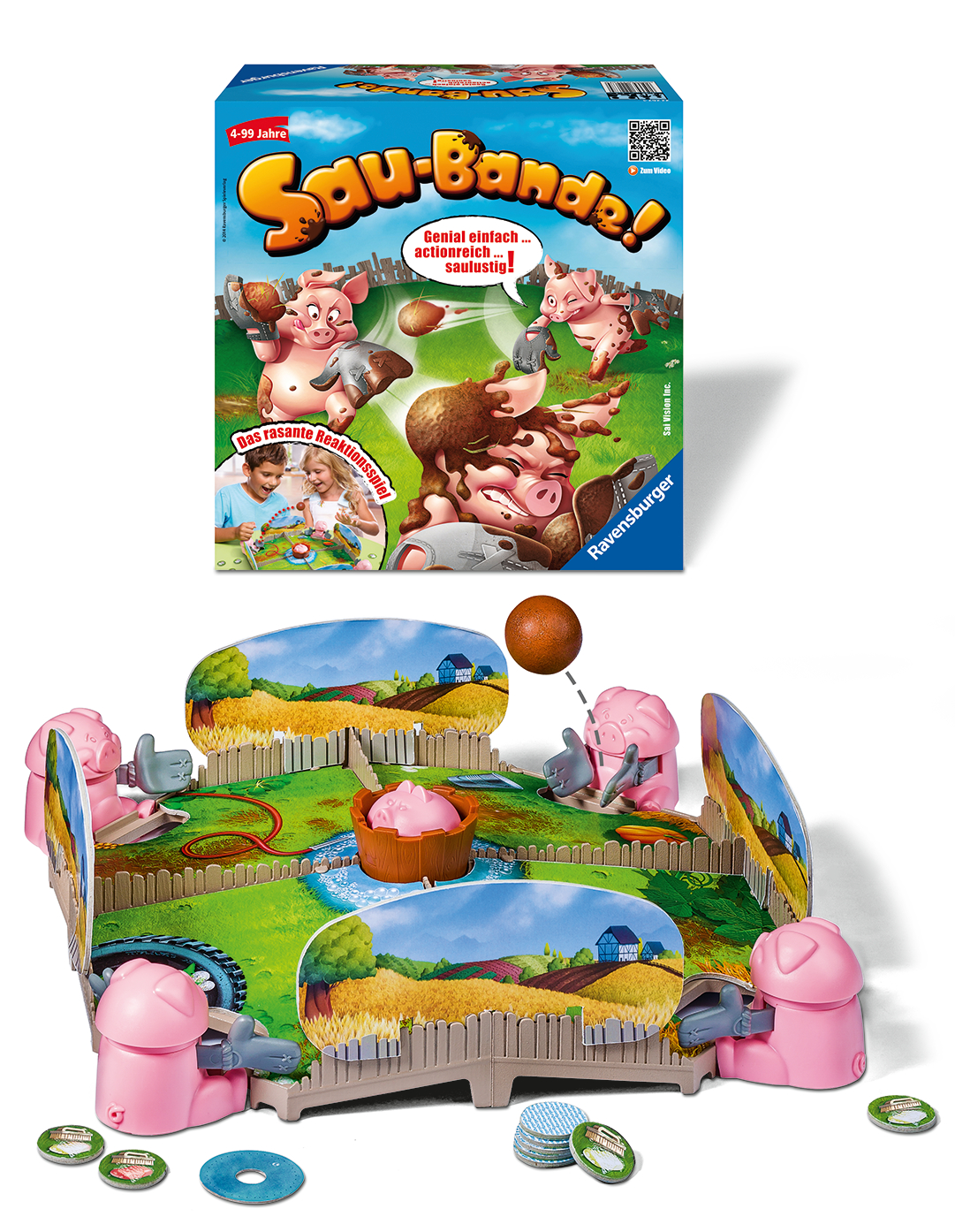 Kaum badet die Muttersau gemütlich in ihrem Waschzuber, ist unter den Ferkeln die schönste Schlammschlacht im Gange. Beim Kinderspiel "Sau-Bande!" schleudert jedes Ferkel (Spieler) den Matschball so schnell wie möglich zu einem anderen Ferkel. Doch Achtung! Die Muttersau (Timer) kann jeden Moment wieder aus ihrem Zuber auftauchen. Wen wird die Mutter mit dem Matschball erwischen? Dieser Spieler kassiert einen der unbeliebten "Wasch-dich!"-Chips. Das Spiel endet, wenn ein Spieler als erster drei Chips hat, dann ist er das sauberste Ferkel, und das will kein anständiges Schwein sein. Immer wieder während des Spiels, wenn die Muttersau ihr Wasser wechseln möchte und ihren Zuber für eine Weile verlässt, findet das Pfützenfest statt. Jetzt ist Geschicklichkeit gefragt: Der erste, der mit dem Matschball genau in die Pfütze trifft, darf einen "Wasch dich!"-Chip abgeben. Sau-Bande! - Genial einfach und saulustig.