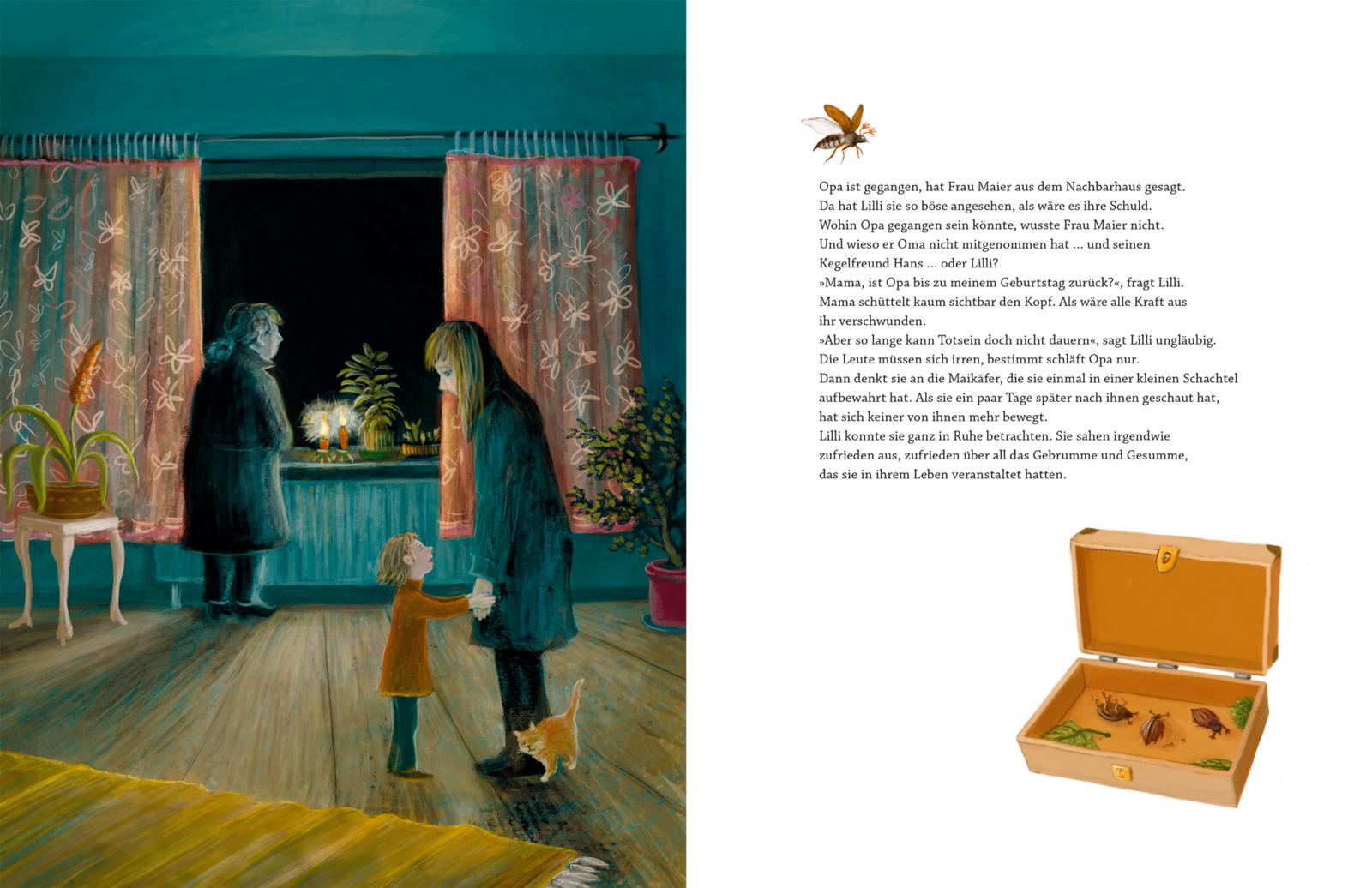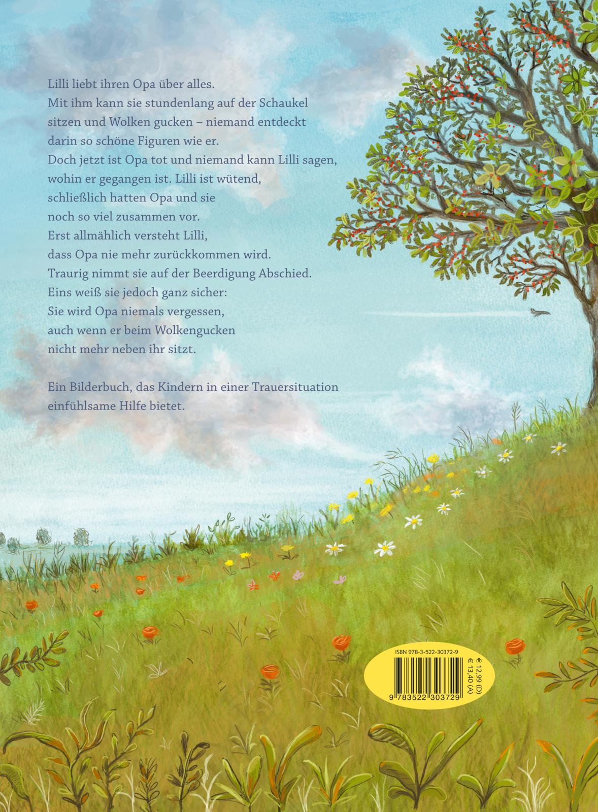 Lilli liebt ihren Opa über alles. Mit ihm kann sie stundenlang auf der Schaukel sitzen und Wolken gucken - niemand entdeckt darin so schöne Figuren wie er. Doch jetzt ist Opa tot und niemand kann Lilli sagen, wohin er gegangen ist. Lilli ist wütend, schließlich hatten Opa und sie noch so viel zusammen vor. Erst allmählich versteht Lilli, dass Opa nie mehr zurückkommen wird. Traurig nimmt sie auf der Beerdigung Abschied. Eins weiß sie jedoch ganz sicher: Sie wird Opa niemals vergessen, auch wenn er beim Wolkengucken nicht mehr neben ihr sitzt. Ein tröstliches Bilderbuch über den Verlust des Opas.