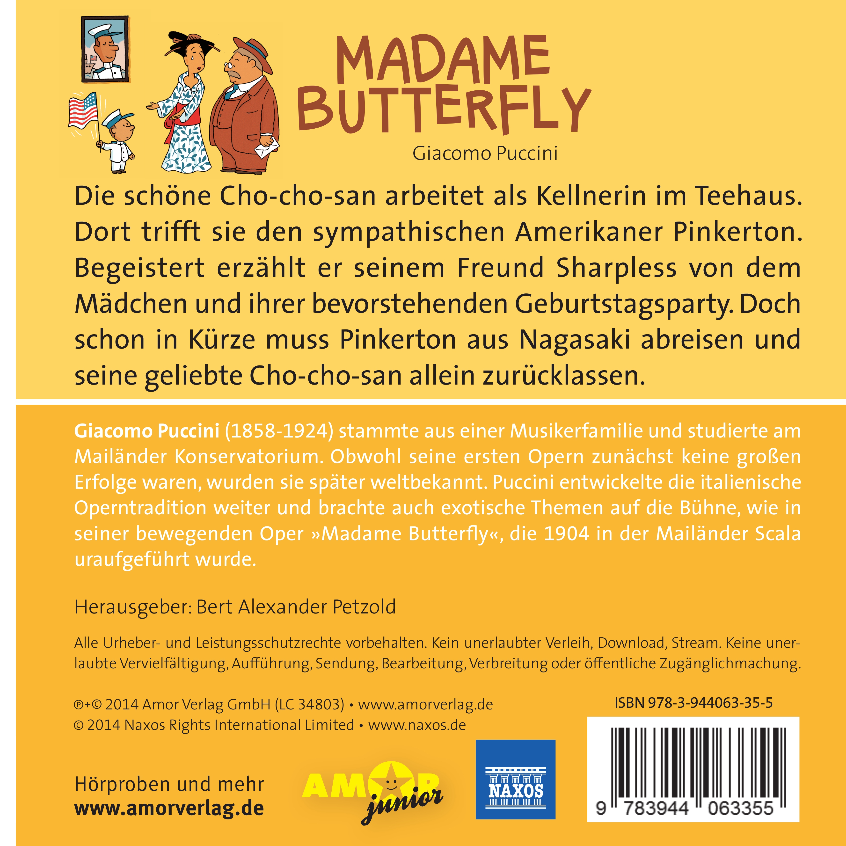 | Schlagworte | alt • Butterfly • CD • Erwachsene • Familie • Gesang • Hörbuch • Hörbuch; Hörspiel für Kinder/Jugendliche • Hörspiel • Japan • jung • Kind • Kindgerecht • Klassik-CDs Kinder-CDs • Klassiker • Liebhaber • Madame • Madame Butterfly • Musik • Musikstück • Nagasaki • Oper • Pinkerton • Puccini • Puccini, Giacomo • Zamperoni, Luca • Zeit |